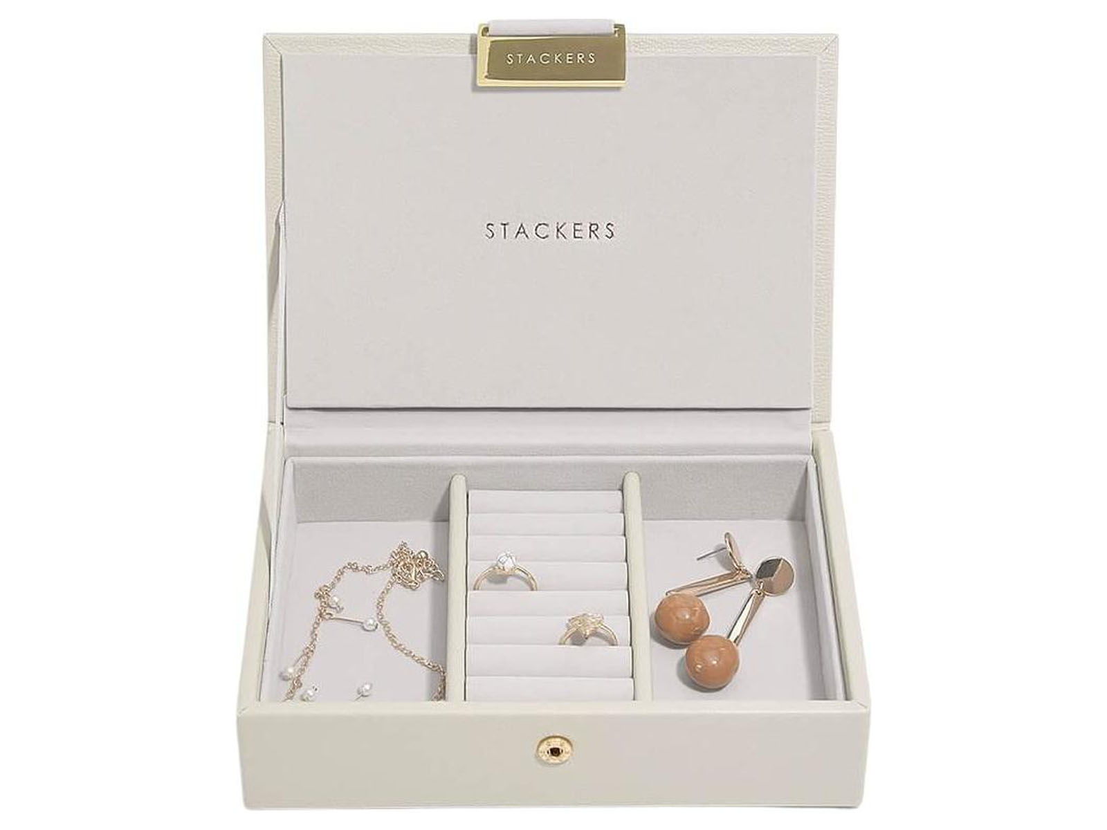Szkatułka Stackers Mini to mała elegancka szkatułka idealna do przechowywania i zorganizowania podręcznej kolekcji biżuterii. Szkatułka posiada 3 przegródki do przechowywania każdego rodzaju biżuterii: bransoletek, naszyjników, pierścionków czy kolczyków.