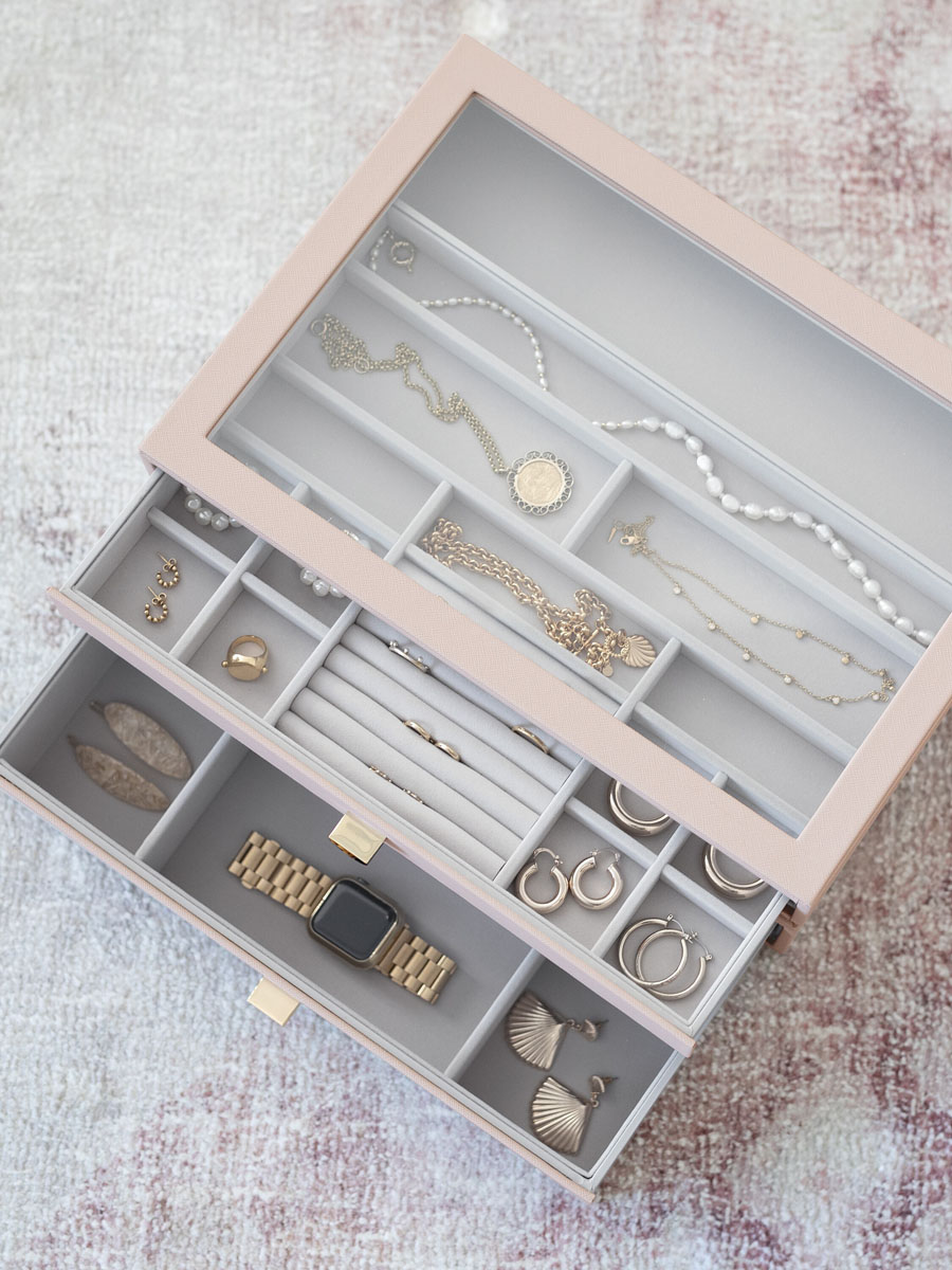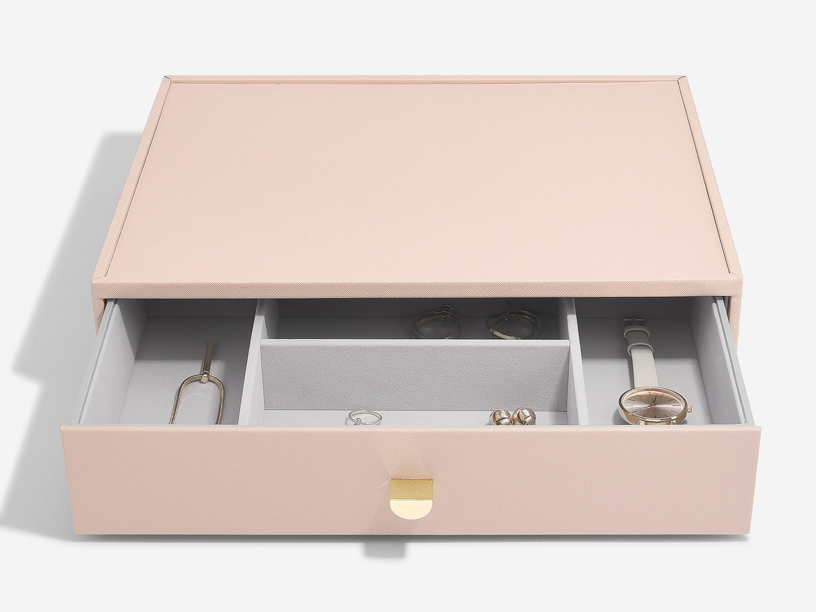 Szkatułka posiada przezroczystą szklaną pokrywę zapewniającą widoczność i łatwy dostęp do ulubionych elementów. A najważniejszy jest fakt, że w miarę potrzeby i powiększania się kolekcji można z łatwością powiększyć szkatułkę dodając kolejną warstwę szuflady na biżuterię!