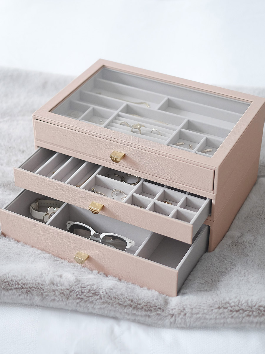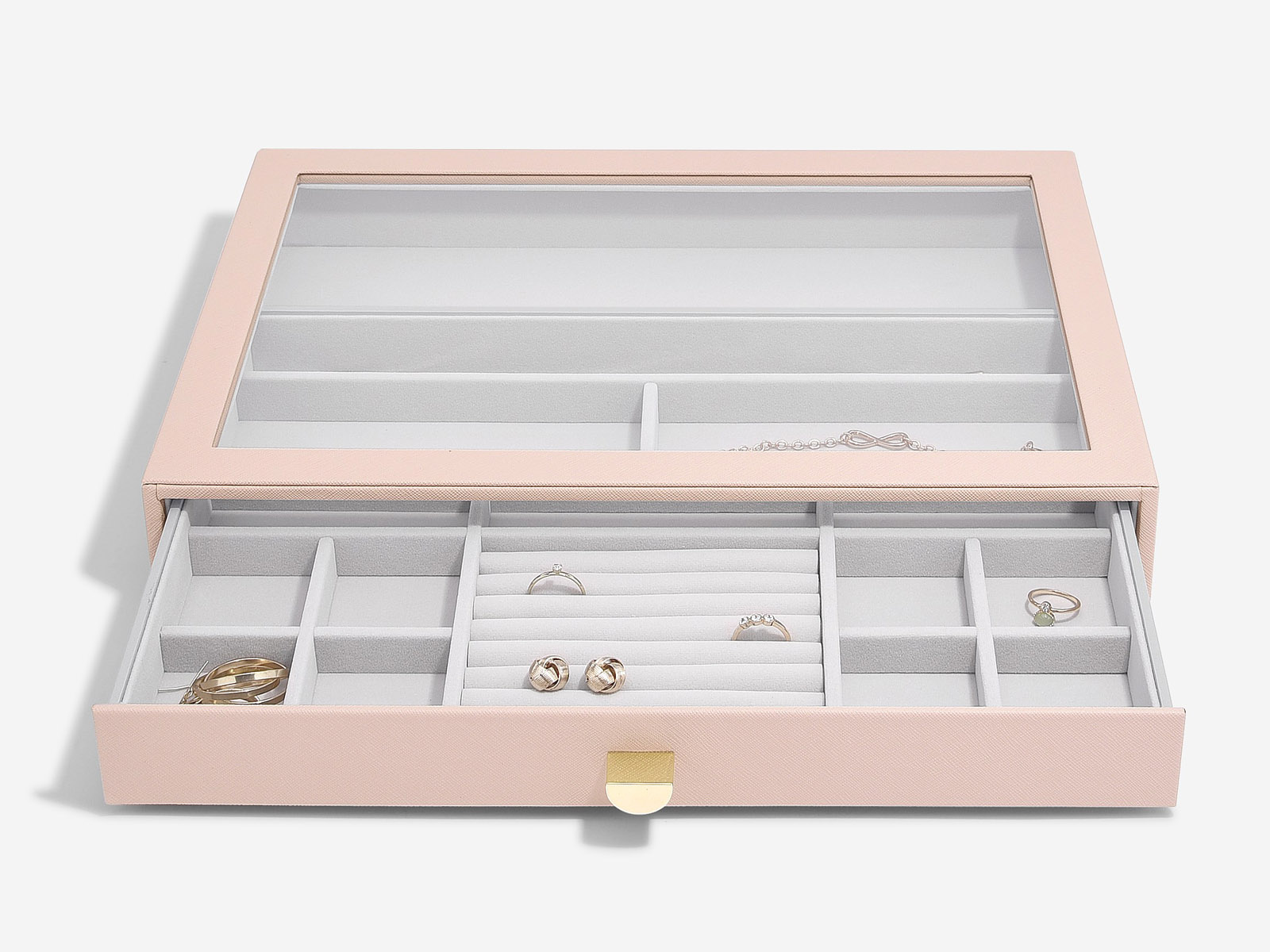 Szkatułka posiada przezroczystą szklaną pokrywę zapewniającą widoczność i łatwy dostęp do ulubionych elementów. A najważniejszy jest fakt, że w miarę potrzeby i powiększania się kolekcji można z łatwością powiększyć szkatułkę dodając kolejną warstwę szuflady na biżuterię.