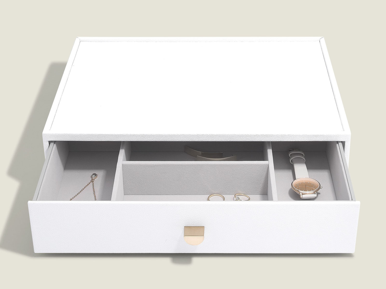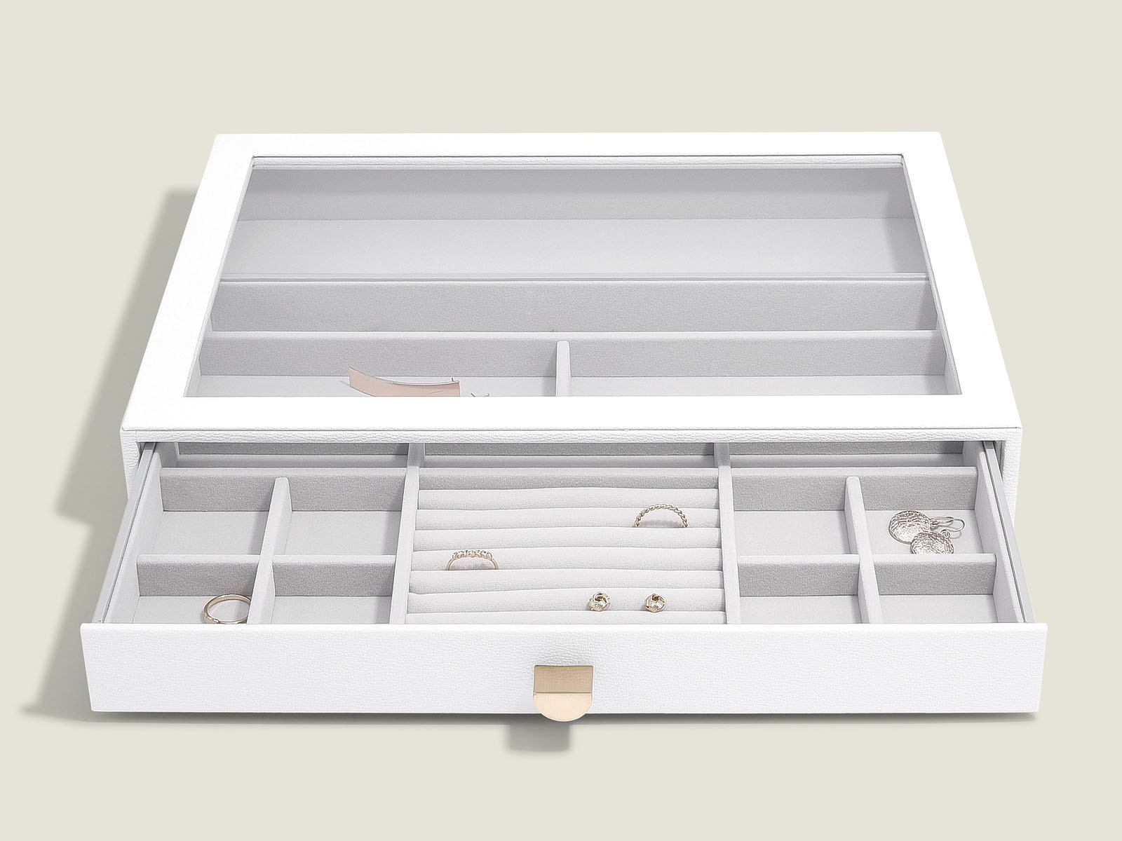 Szkatułka posiada przezroczystą szklaną pokrywę zapewniającą widoczność i łatwy dostęp do ulubionych elementów. A najważniejszy jest fakt, że w miarę potrzeby i powiększania się kolekcji można z łatwością powiększyć szkatułkę dodając kolejną warstwę szuflady na biżuterię!