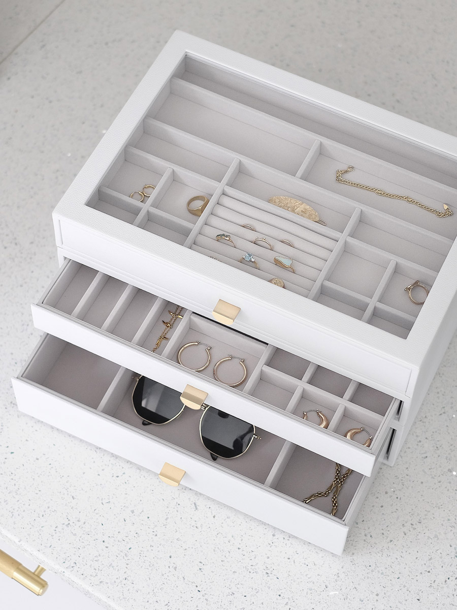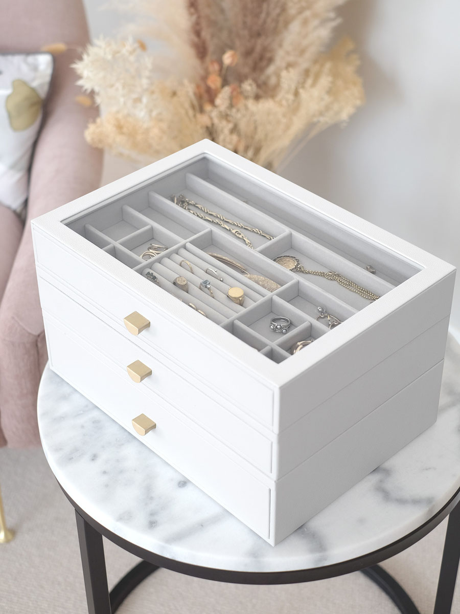 Szkatułka posiada przezroczystą szklaną pokrywę zapewniającą widoczność i łatwy dostęp do ulubionych elementów. A najważniejszy jest fakt, że w miarę potrzeby i powiększania się kolekcji można z łatwością powiększyć szkatułkę dodając kolejną warstwę szuflady na biżuterię.