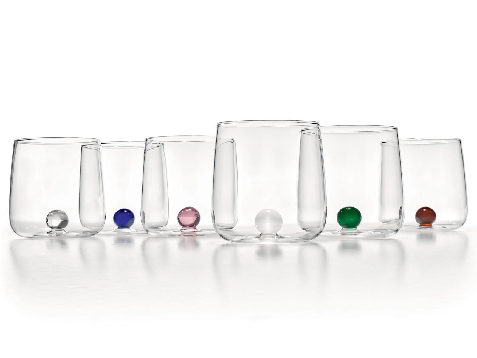 Zafferano Bilia to przepiękna kolekcja szkła stołowego, zaprojektowana przez Federica de Majo. Stylistycznie kolekcja zainspirowana została dziecięcą zabawą szklanymi kulkami na brzegiem Morza Śródziemnego. Myśl ta zostałą wręcz dosłownie przeniesiona do projektu szkła, w którym pojawia się dekoracyjny motyw szklanej kulki zanurzonej na dnie naczynia jak w przypadku szklanek i kieliszków lub będąca jego elementem funkcjonalnym jak w przypadku karafek czy filiżanek.