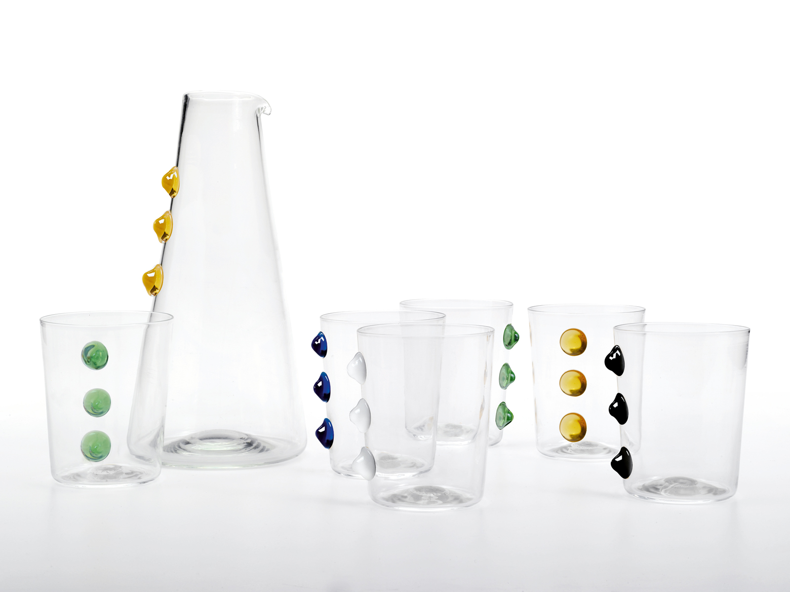Zafferano Petoni, to przepiękna i bardzo praktyczna kolekcja szkła stołowego, zaprojektowana przez Federica de Majo. Stylistycznie kolekcja przywodzi na myśl dziecięcą zabawkę, figurkę smoka lub dinozaura. Myśl ta zostałą wręcz dosłownie przeniesiona do projektu szkła, w którym pojawia się dekoracyjny motyw trzech szklanych wypustek "na grzbiecie" naczynia. Jest to nie tylko element dekoracyjny, ale również element funkcjonalny, który ułatwia chwyt szklanki lub karafki.
