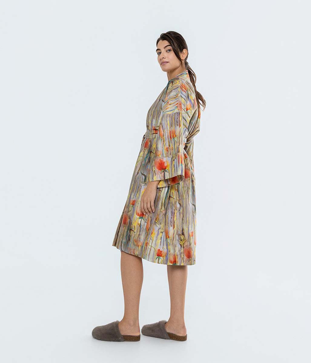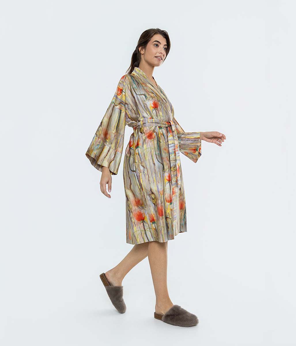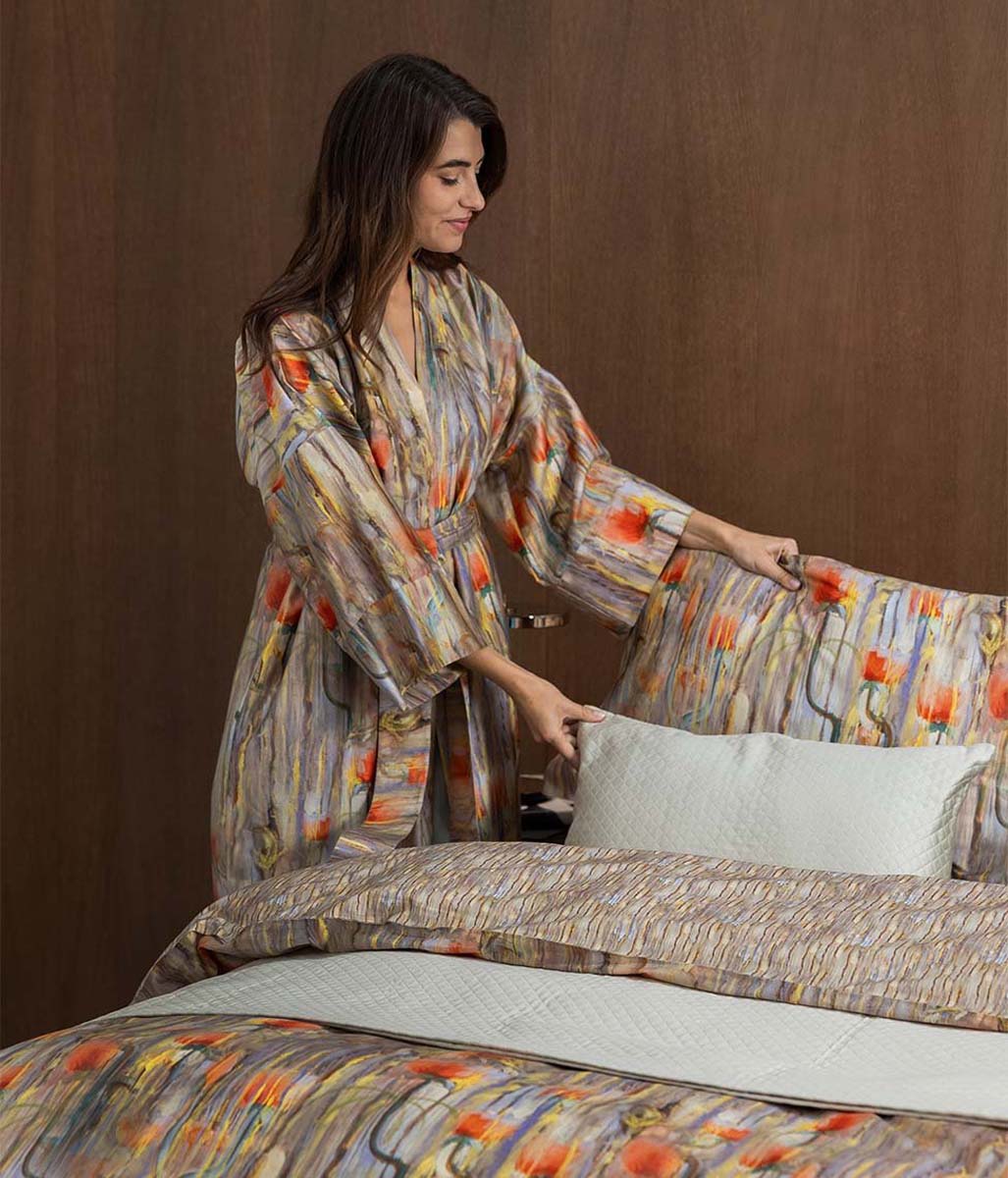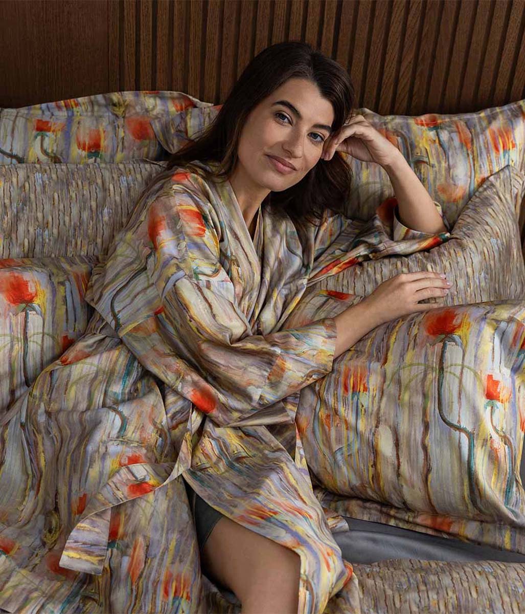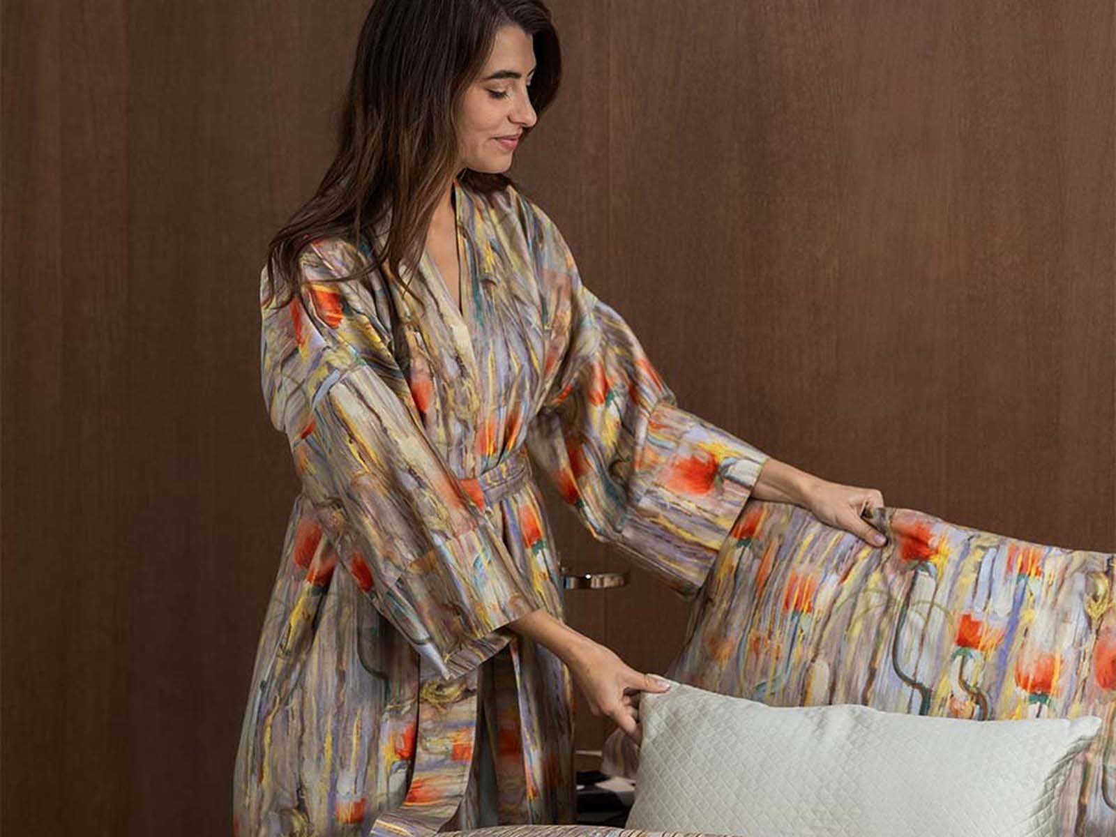 Szalfroki Decoflux Kimono to najwyższej jakości elegancki szlafrok satynowy wykonany w 100% z wyselekcjonowanej przędzy bawełny egipskiej. Tkanina jest bardzo bardzo miła, komfortowa trwała w użytkowaniu.
