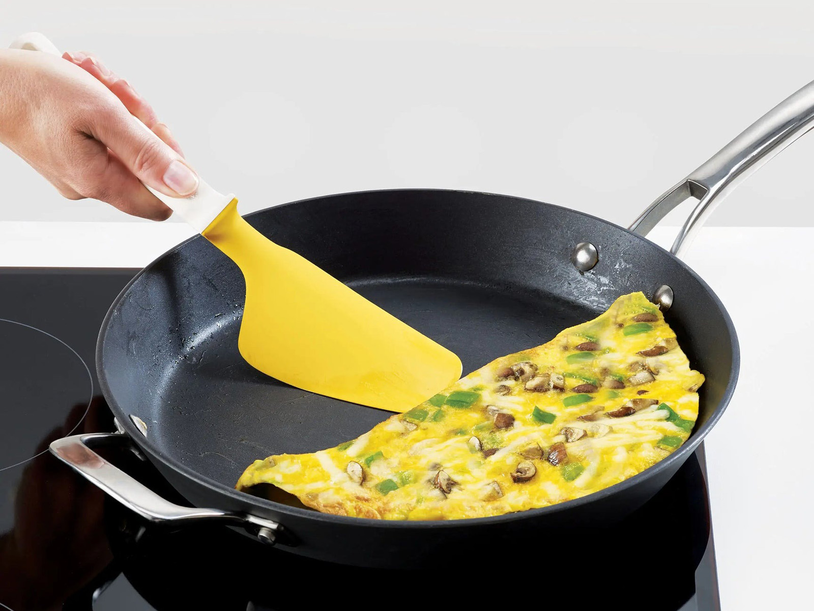 Praktyczna szpatułka do przygotowywania jajek w różnej formie idealnie nadaje się do robienia omletów, jajecznicy i jajek sadzonych.