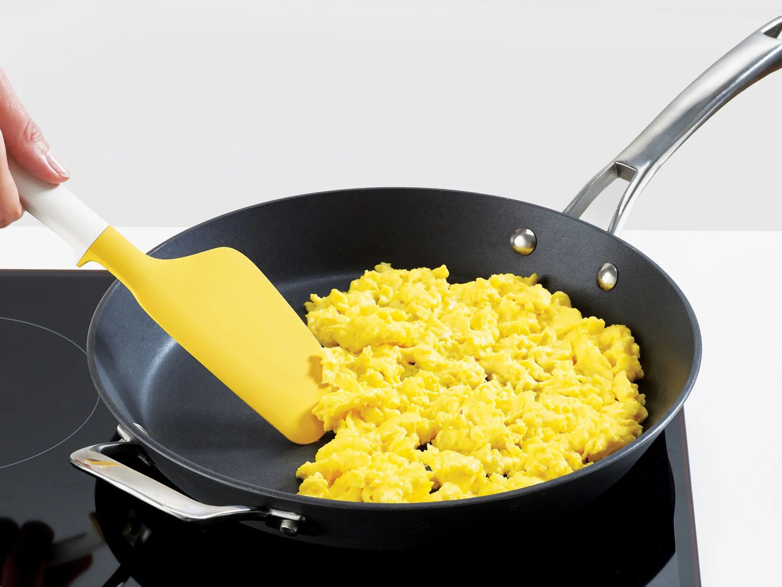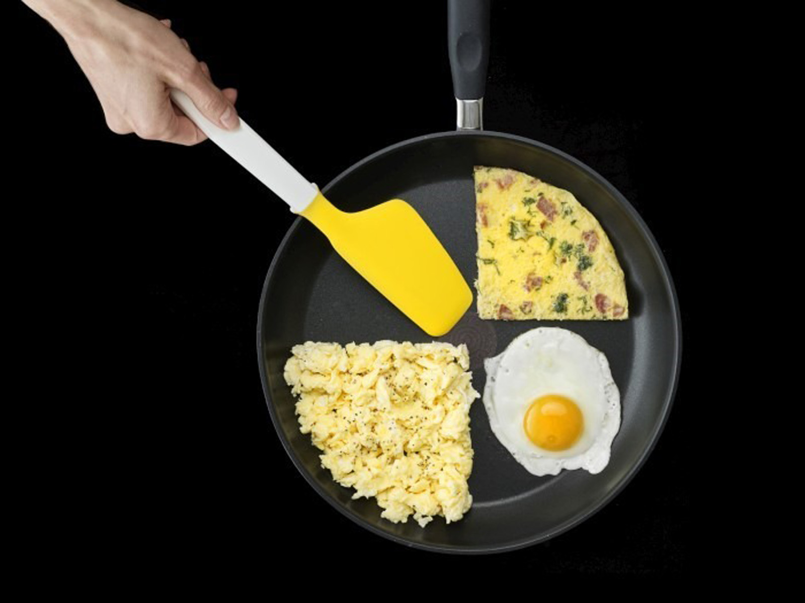 Kształt główki przystosowany do różnych zadań: czubek główki jest mocny, dzięki czemu idealnie nadaje się do mieszania, długa krawędź jest miękka i elastyczna, dzięki czemu idealnie nadaje się do podnoszenia i obracania omletów, a szeroka płaska końcówka jest przeznaczona do łatwego podnoszenia jaj po usmażeniu.