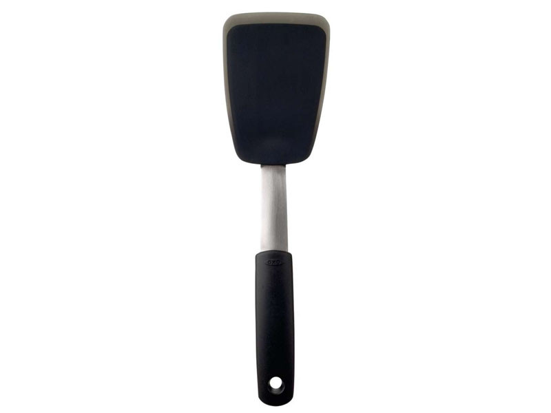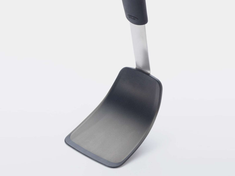 Praktyczna uniwersalna lekko wydłużona szpatułka do obracania i przesuwania na patelni większych produktów np. filetów rybnych, jaj sadzonych, omletów, naleśników, hamburgerów.