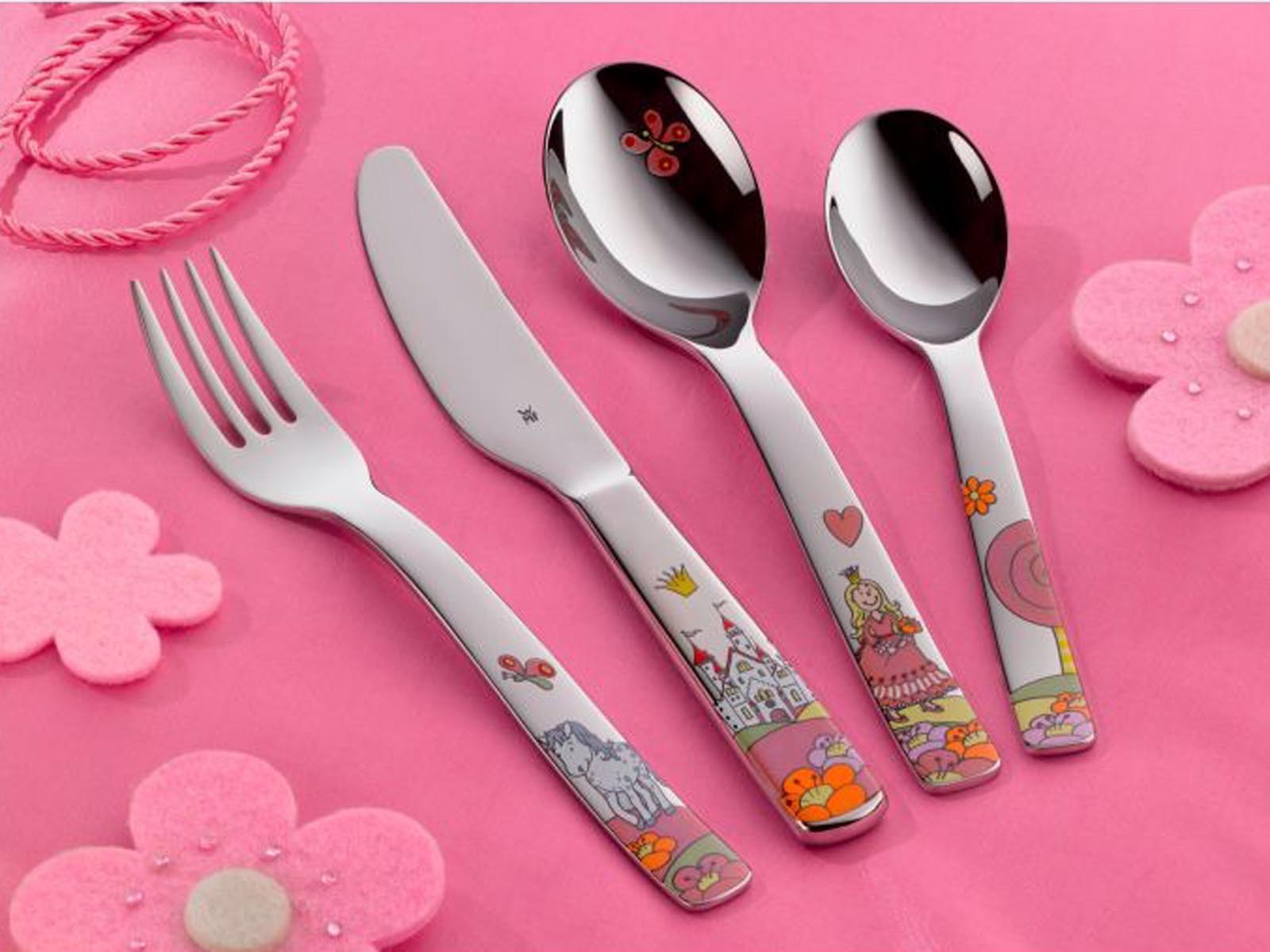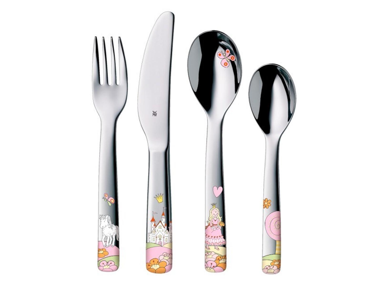 Elegancki 4 elementowy zestaw stołowych sztućców dla dzieci z motywem bajkowym Księżniczka Anneli.