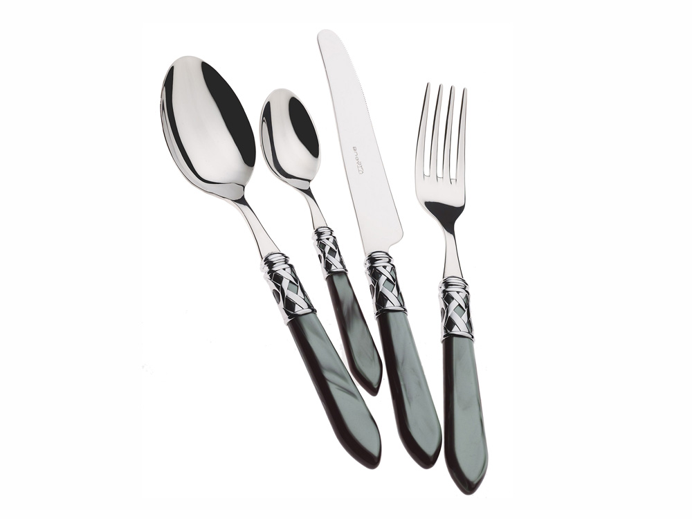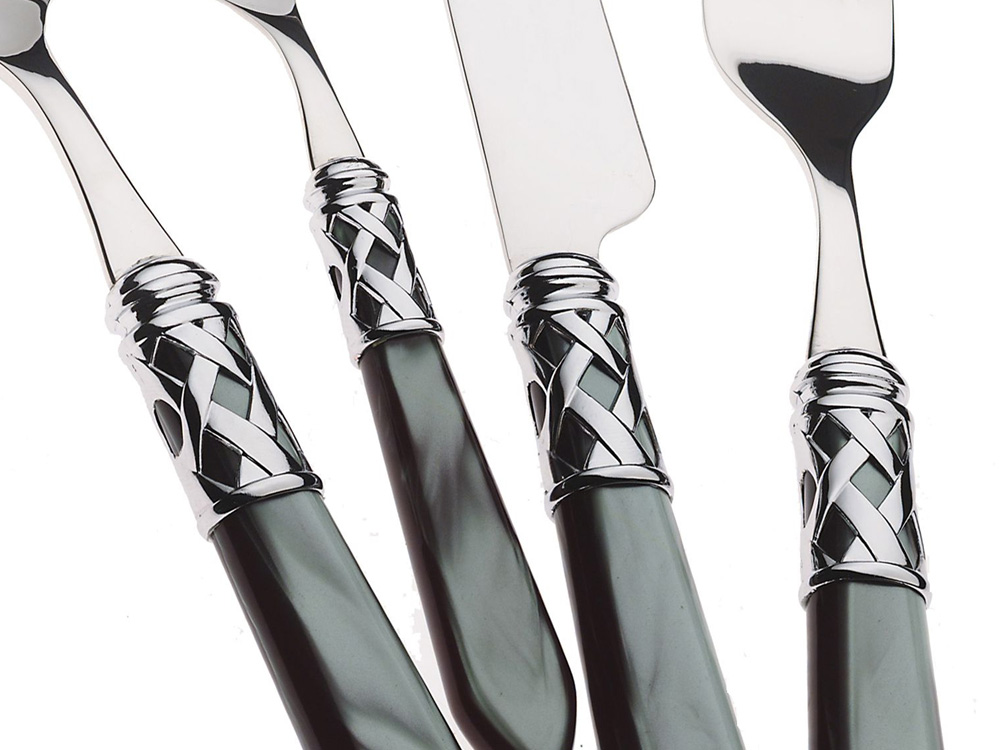 Sztućce wykonane z wysokiej jakości stali nierdzewnej z akrylowymi trzonkami w kolorze perłowej czerni.