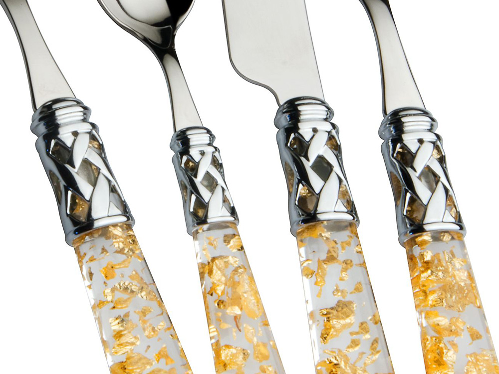 Sztućce wykonane z wysokiej jakości stali nierdzewnej z akrylowymi przezroczystymi trzonkami ze złotymi drobinkami.