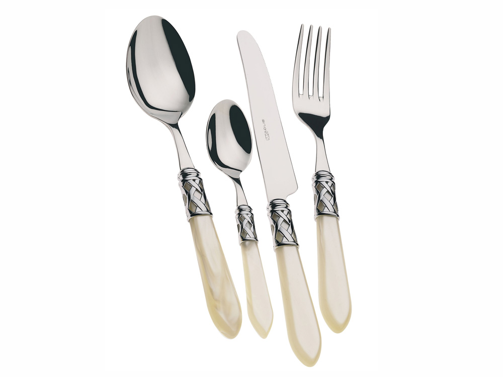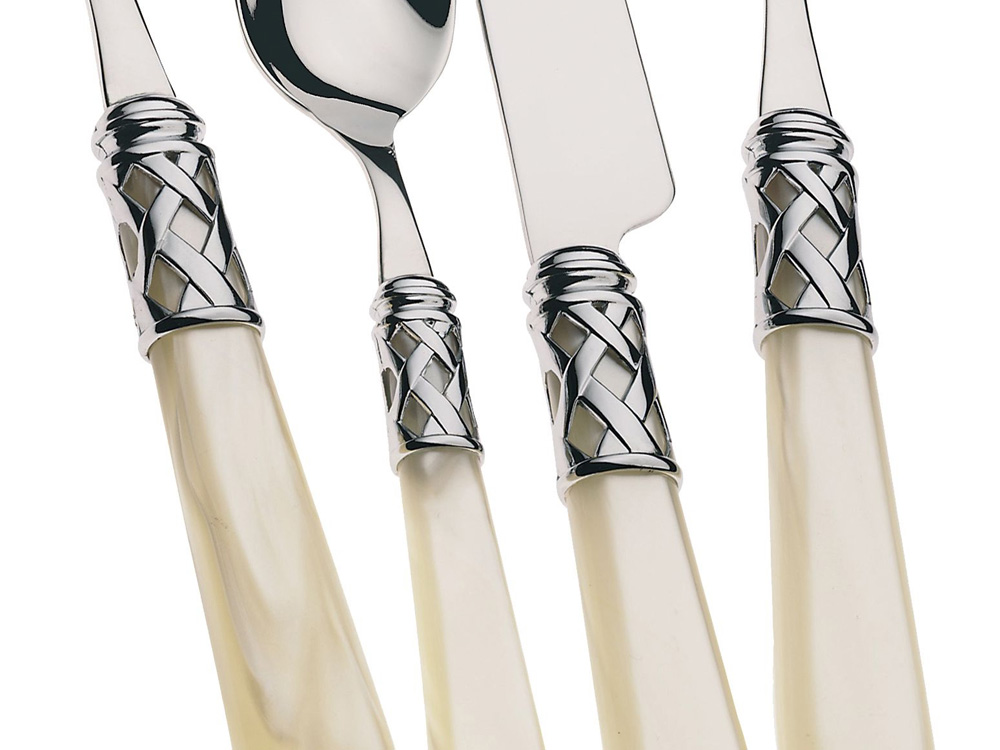 Sztućce wykonane z wysokiej jakości stali nierdzewnej z akrylowymi trzonkami w kolorze perłowej kości słoniowej.