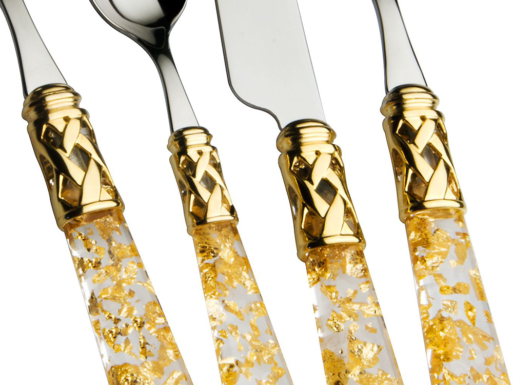 Sztućce wykonane z wysokiej jakości stali nierdzewnej z akrylowymi przezroczystymi trzonkami ze złotymi drobinkami.