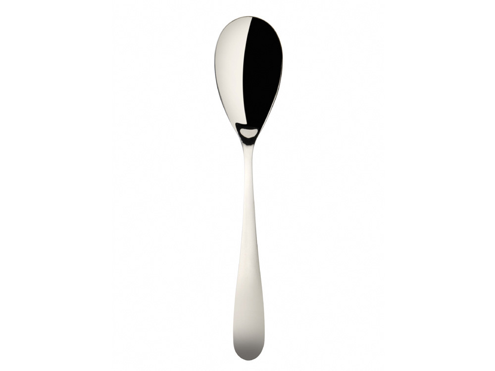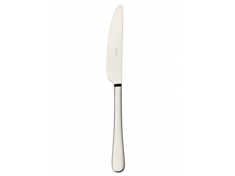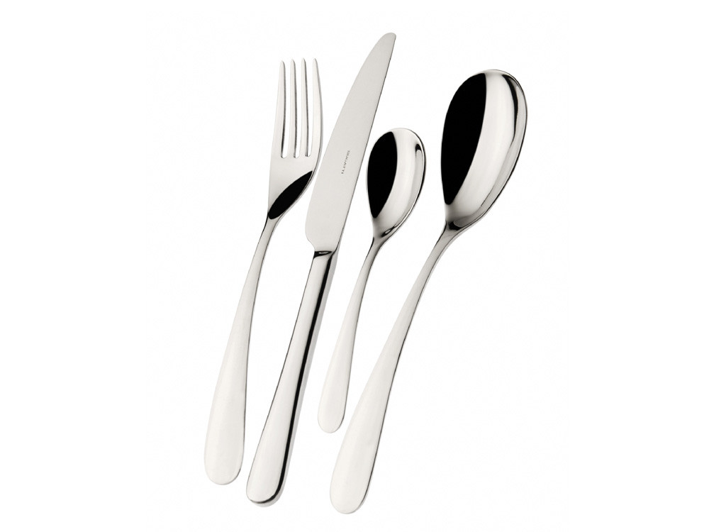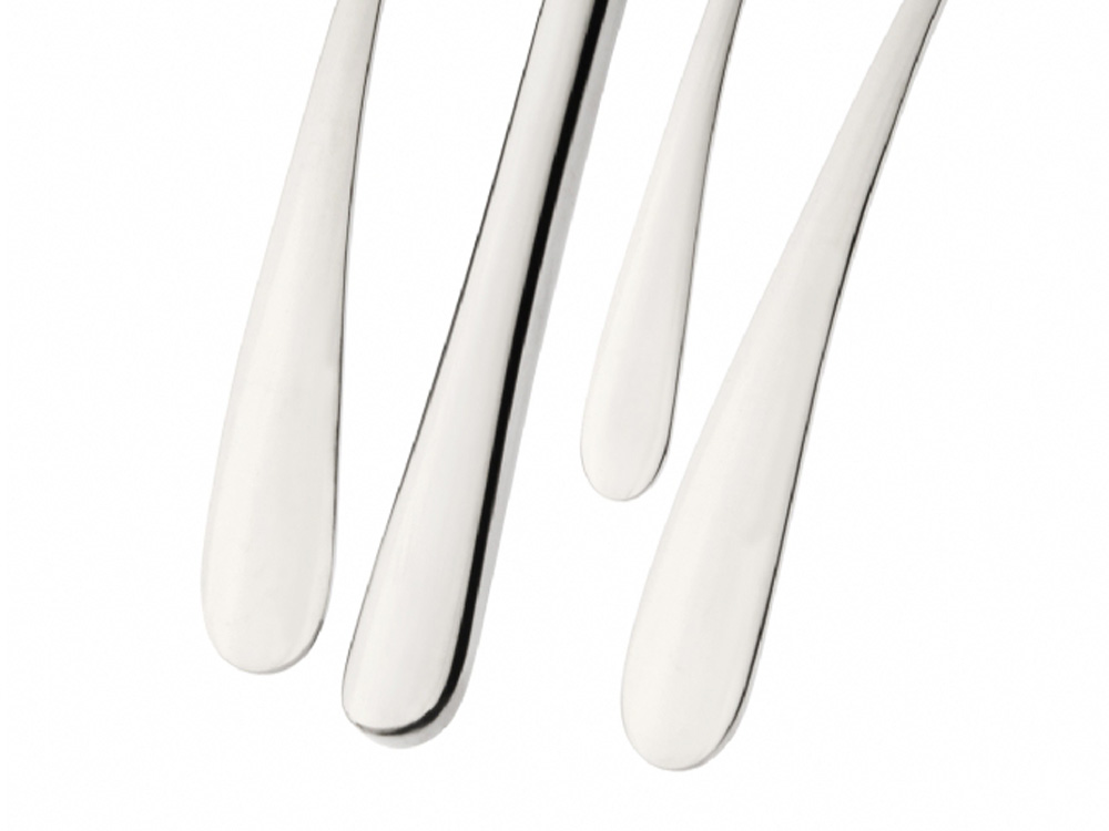 Sztućce o klasycznej lini z gładkimi jednolitymi trzonkami zakończonymi na półokrągło oraz łezkowatymi główkami łyżek, noże monoblokowe.