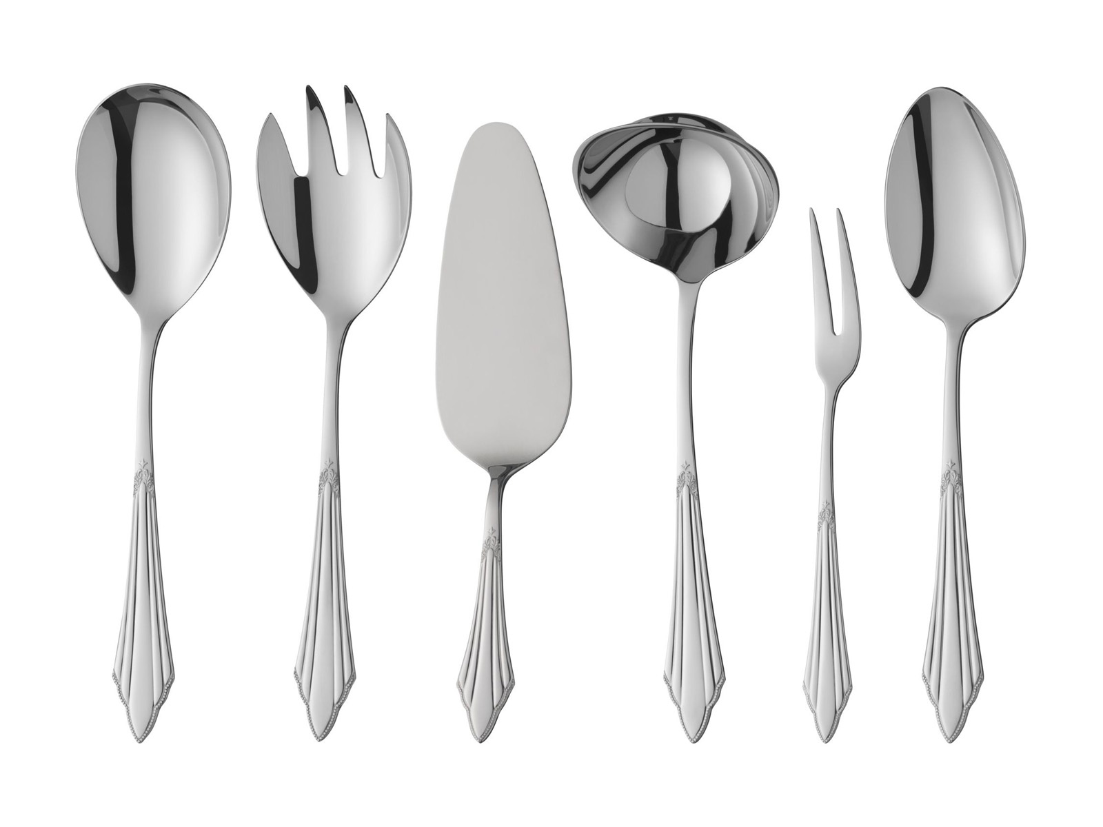 W zestawie znajduje się 66 elementów w tym: 12 łyżek stołowych, 12 widelców, 12 noży, 12 łyżeczek deserowych, 12 widelczyków do ciasta oraz 6 sztućców do serwowania: 1 łyżka do serwowania, 1 widelec do serwowania, zestaw 2 łyżek do sałatek, 1 łopatka do ciasta i 1 łyżka wazowa.