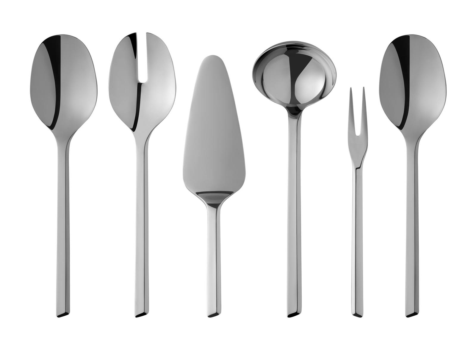 Sztućce świetnie wyważone i wyprofilowane dobrze leżą w dłoni, uchwyty sztućców o smukłym geometrycznym kształcie z asymetrycznymi liniami zakończone skośnie, gładkie bez wzoru.