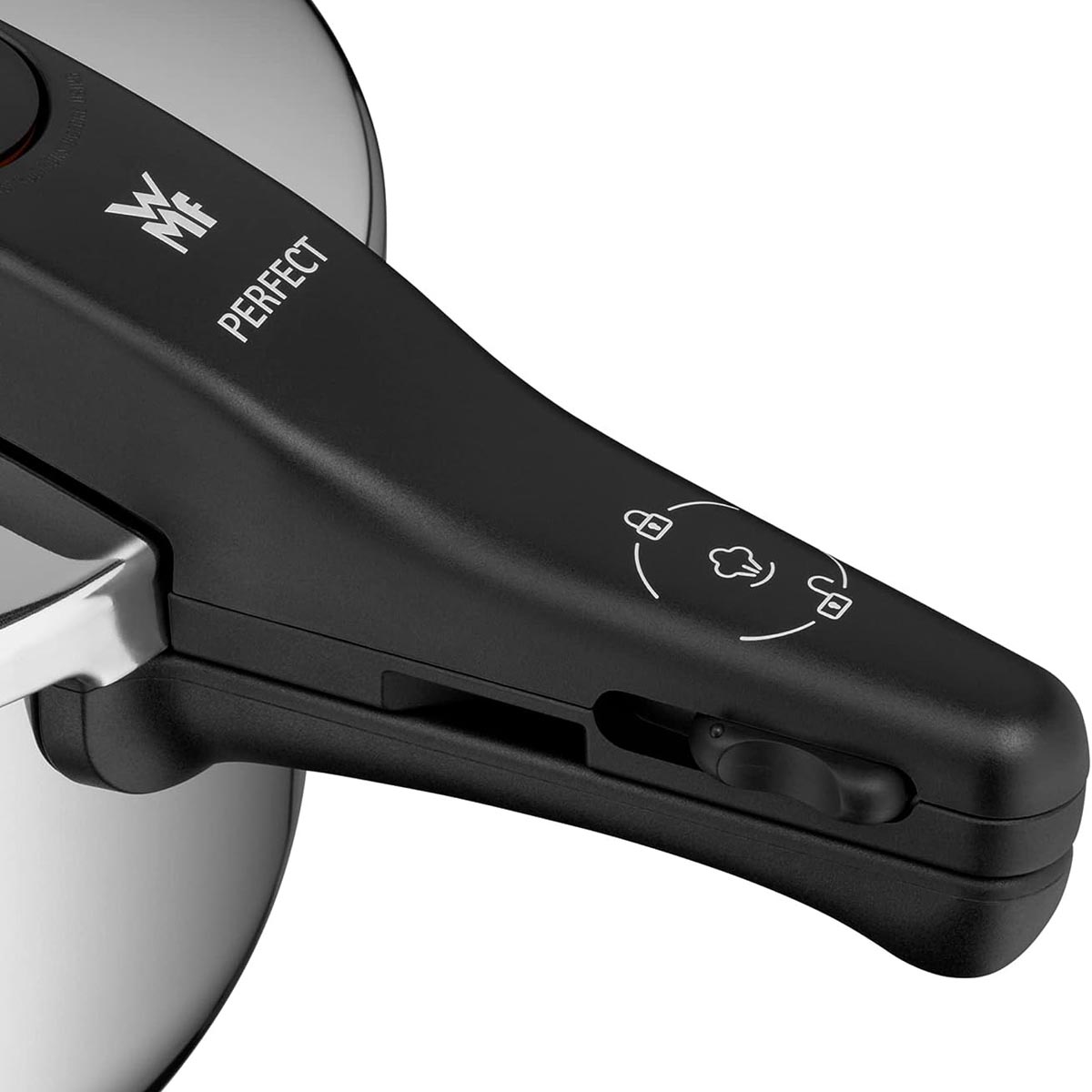Naczynie posiada wygodny wykonany z tworzywa sztucznego uchwyt z 2-poziomową regulacją temperatury gotowania (110°C dla warzyw, ryb i 119°C dla mięsa, ziemniaków, potraw jednogarnkowych) oraz wielopoziomowym systemem bezpieczeństwa zapewniającym bezpieczne gotowanie pod ciśnieniem - boczny suwak na uchwycie ułatwia otwieranie i zamykanie oraz stopniowe odparowywanie.