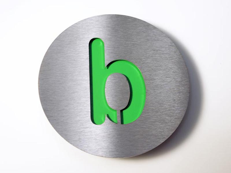 Wykonane na bazie dwóch powierzchni, z których pierwsza wykonana ze stali nierdzewnej posiada wycięty znak, druga natomiast malowana proszkowo, kontrastuje w tle.