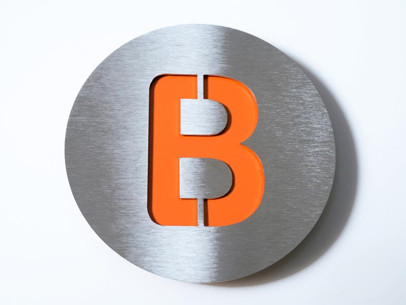 Wykonane na bazie dwóch powierzchni, z których pierwsza wykonana ze stali nierdzewnej posiada wycięty znak, druga natomiast malowana proszkowo, kontrastuje w tle.