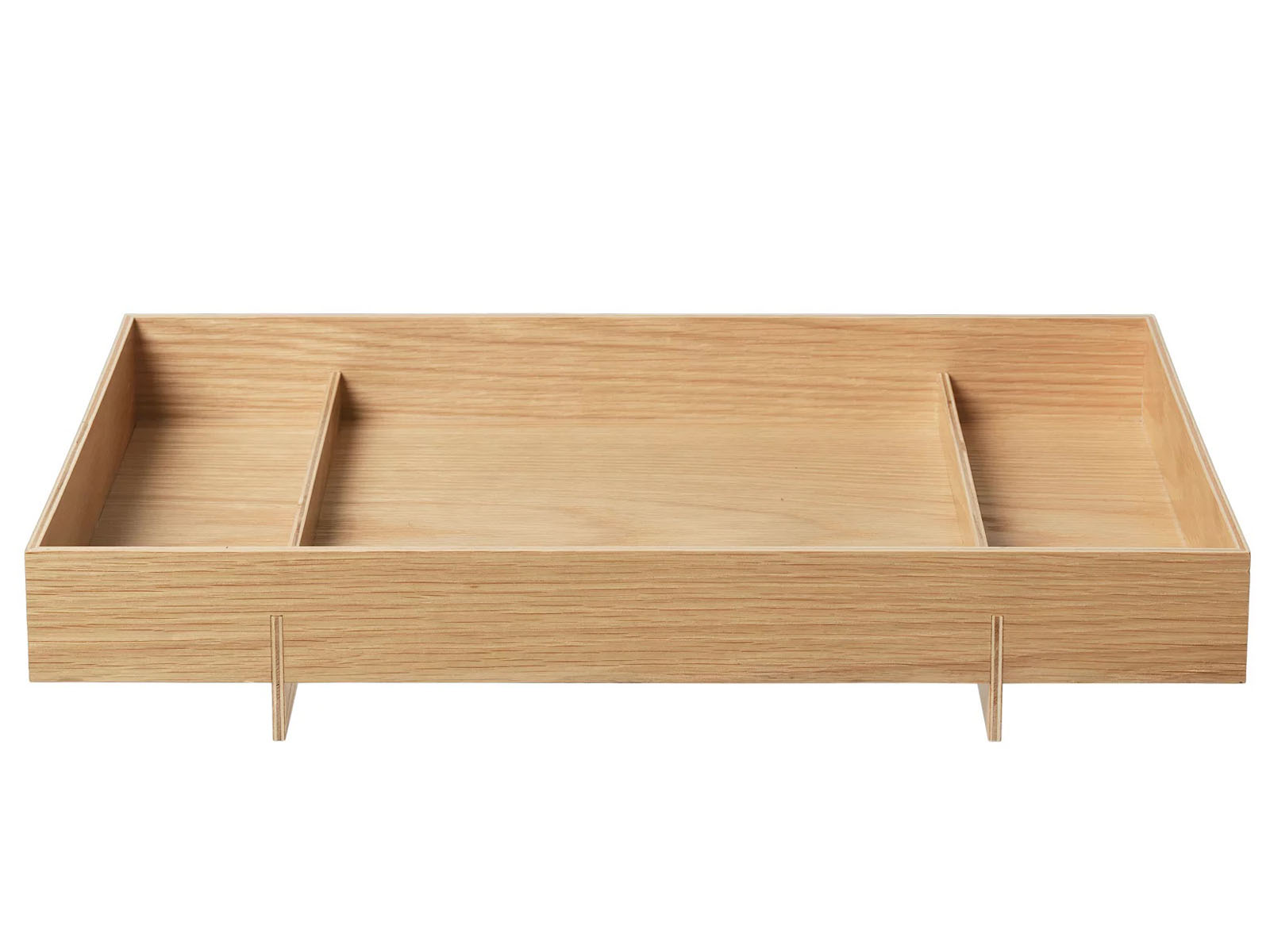 Projekt tac Abento wyróżnia się unikatowym rozwiązaniem - dwoma nogami, które ułatwiają chwytanie i przenoszenie. Nogi te przecinają korpus tacy, dzieląc jej powierzchnię na trzy praktyczne sekcje, co ułatwia organizację i podział przestrzeni na różne przedmioty. Ta inteligentna konstrukcja zapewnia wygodę użytkowania na co dzień, a także sprawia, że taca jest wyjątkowo łatwa w obsłudze.