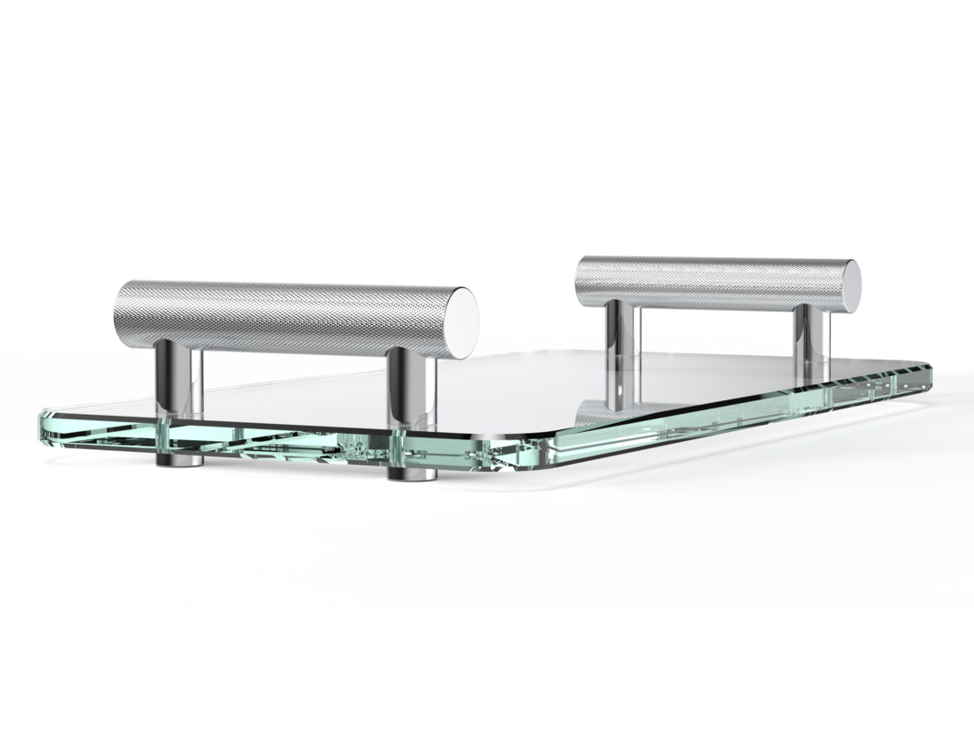 Elegancka duża prostokątna płaska tacka/ podstawka łazienkowa wykonana z przezroczystego szkła z dwoma wygodnymi metalowymi uchwytami.