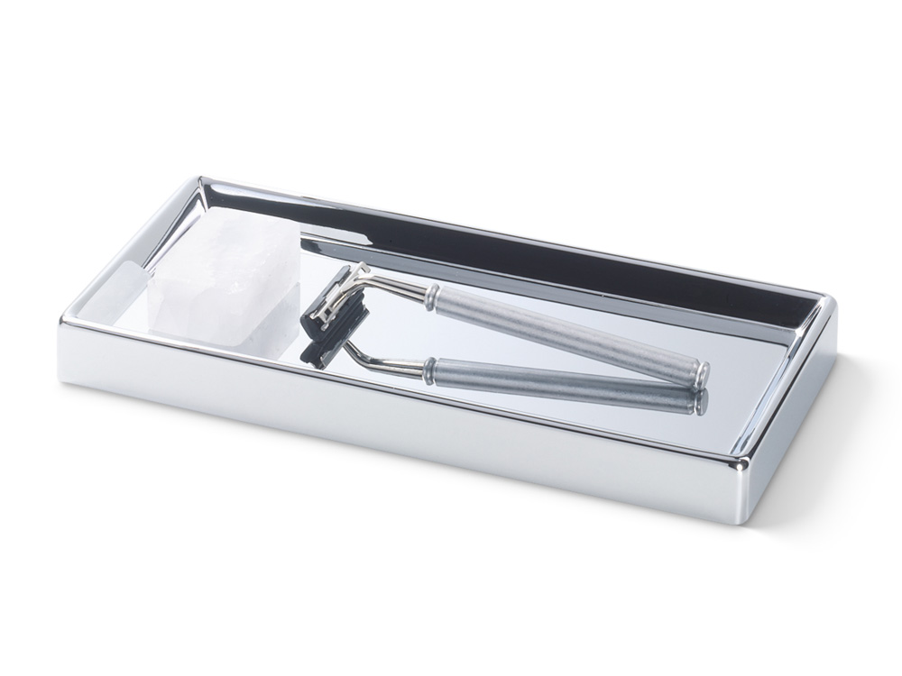 Elegancka prostokątna tacka łazienkowa wykonana z wysokiej jakości chromowanego mosiądzu.