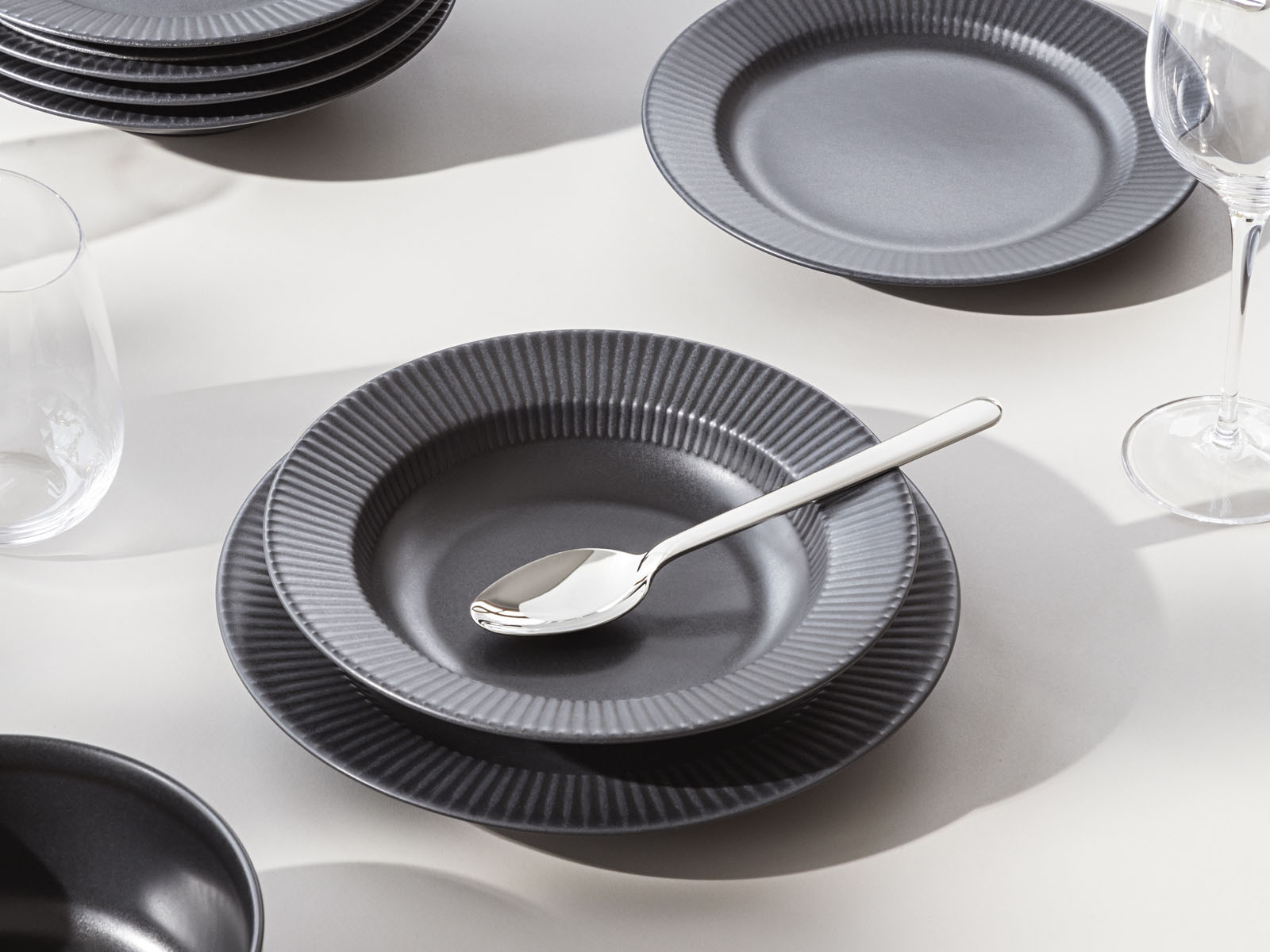Eva Solo Legio Nova Black to wyjątkowa kolekcja eleganckiej zastawy stołowej będąca kontynuacją dobrze znanej białej zastawy Legio Nova. Czarna wersja to zdecydowanie nowa odsłona kolekcji - niezwykle atrakcyjny design oraz wyjątkowa jakość. Charakterystyczne ryflowania pięknie komponują się z półmatową czernią i doskonale eksponują grę światła oraz nadają głębi nakryciu stołu.