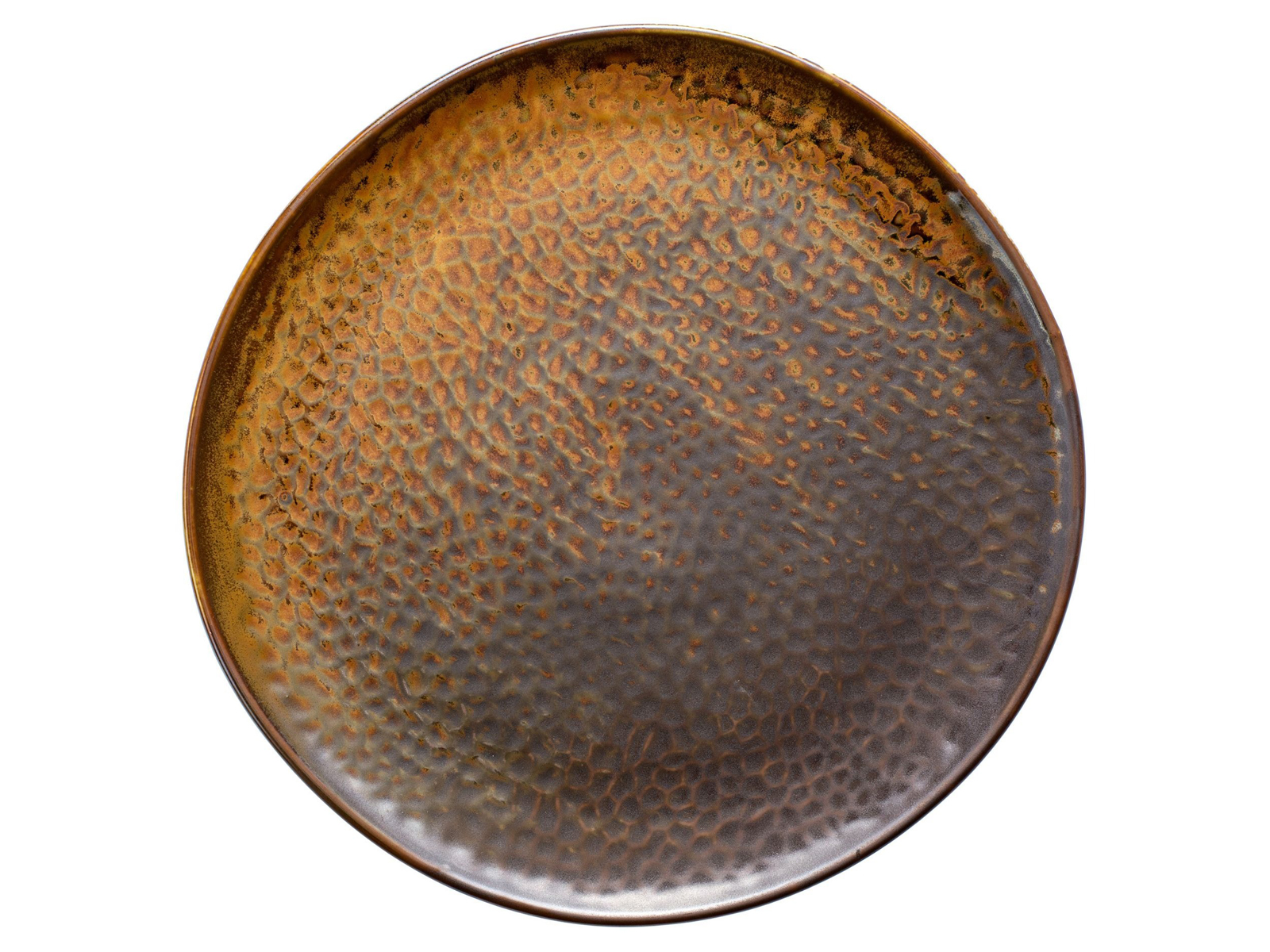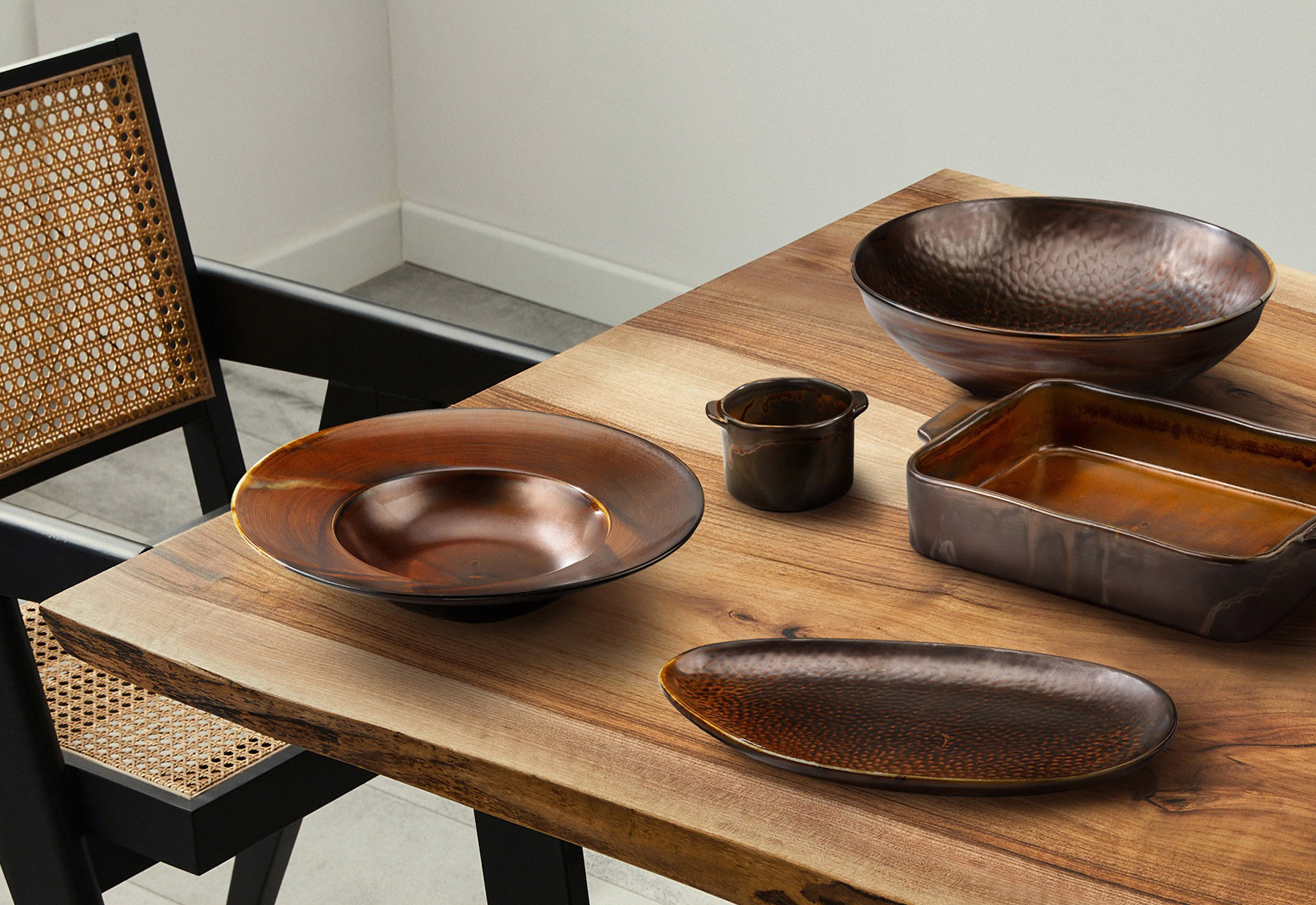 Verlo Fire to niezwykle inspirująca kolekcja, w której zaklęto siłę magmy i żar palonej ziemi. Cała zastawa emanuje nie tylko ciepłem, ale i różnorodnością form, faktur, wzorów i odcieni, uzyskanych dzięki reaktywnemu szkliwu i ręcznemu zdobnictwu. Naczynia pulsują pod matową powierzchnią barwami stygnącej lawy – pomarańczami, żółciami i głębokimi brązami, które podsycają żywiołowy charakter. Młotkowana struktura z wgłębieniami i wypukłościami nadaje talerzom wygląd spękanej wulkanicznej skorupy, a marszczenia – wrażenie mineralnej głębi i metalicznego blasku. Nieregularne paski, plamki, smugi przypominają języki płomieni i krople topionych skał, a falujące ranty brytfann i ramekinów wyglądają jak formowane w samym sercu wulkanu.