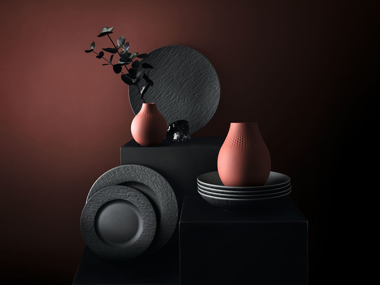 Villeroy&Boch Manufacture Rock Black to wyjątkowa kolekcja niezwykle oryginalnej i niebanalnej zastawy stołowej wykonanej z najwyższej jakości porcelany. Stylistycznie kolekcja inspirowana jest naturalną strukturą kamienia, która, w zależności od elementu kolekcji i jego przeznaczenia, jest wykorzystywana na całej powierzchni naczynia lub tylko na jego cześci. Głębia uzyskanej struktury robi ogromne wrażenie wizualne, a czarny kolor oraz piękna matowa powierzchnia uzupełniają i dopełniają niesamowity efekt.