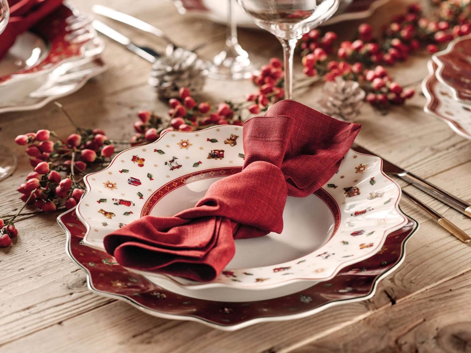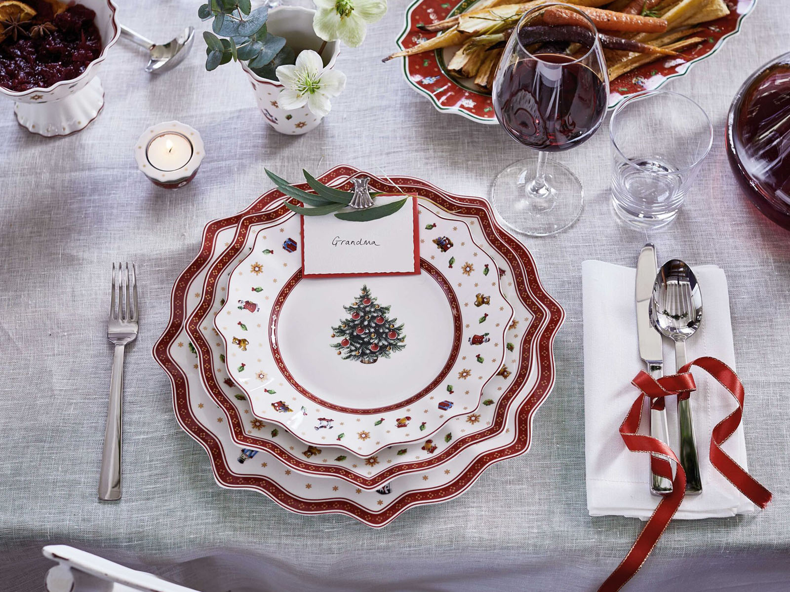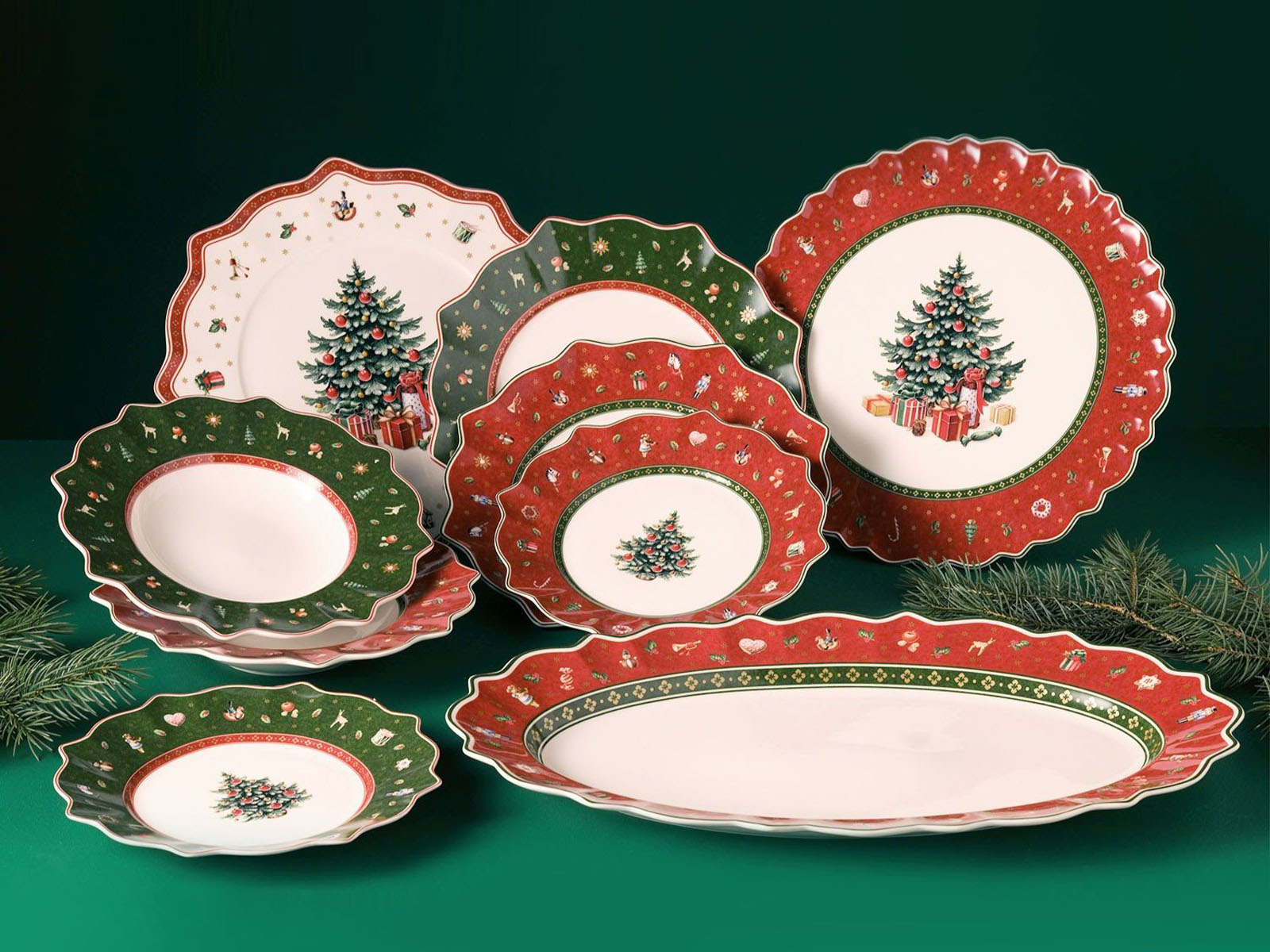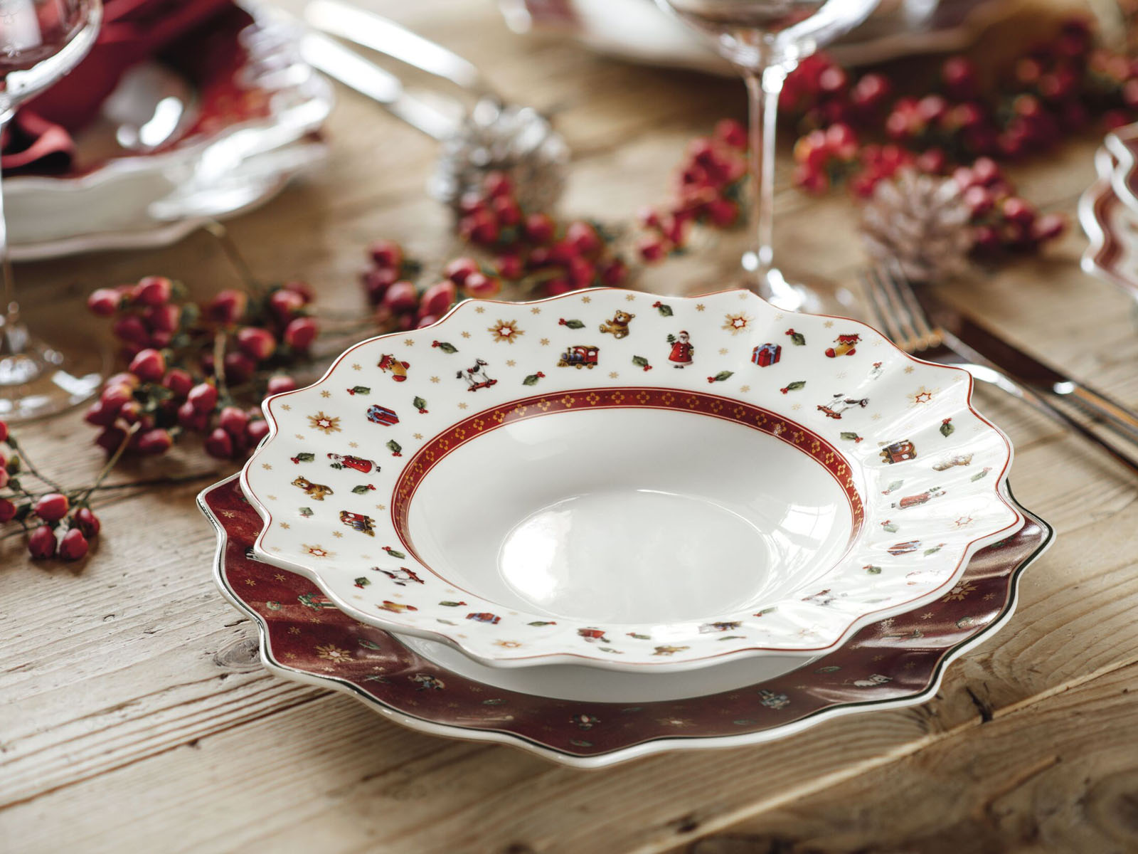 Villeroy&Boch Toy's Delight to wyjątkowo świąteczna bożonarodzeniowa kolekcja niezwykle eleganckiej zastawy stołowej wykonanej z najwyższej jakości porcelany. Stylistyczną inspiracją kolekcji jest magiczny świat świątecznych wspomnień. Zdobią ją ręcznie malowane motywy inspirowane klasycznymi zabawkami i scenami bożonarodzeniowymi, takimi jak uśmiechnięte misie, konie na biegunach czy drewniane pociągi. Utrzymana w tradycyjnej palecie barw – czerwieni, zieleni i bieli – z subtelnymi złotymi akcentami, tworzy ciepłą, elegancką atmosferę. Dzięki różnorodnym elementom, od talerzy po ozdoby stołowe, umożliwia stworzenie harmonijnej świątecznej aranżacji.