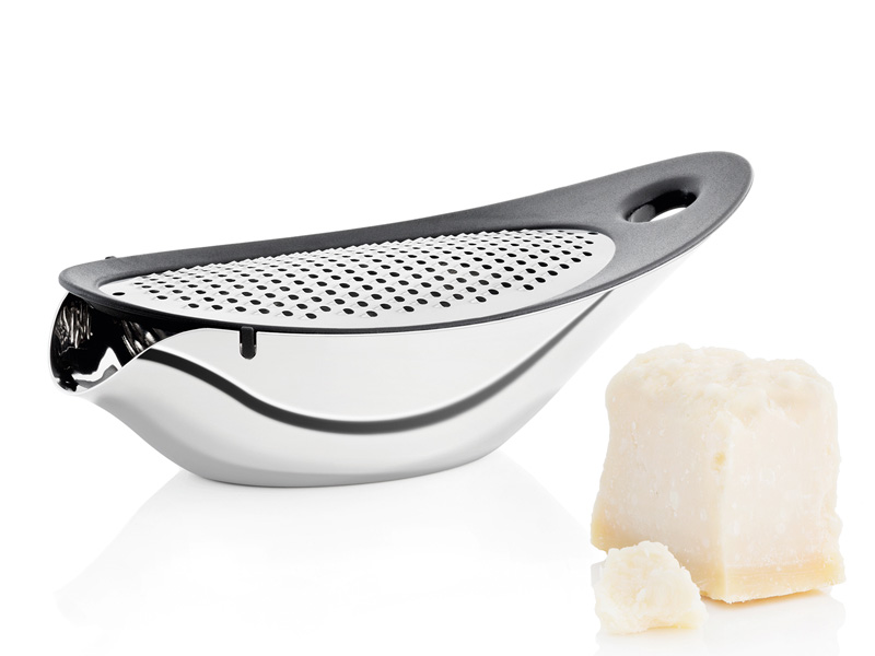 Tarka Navetta to zdecydowanie tarka do sera inna niż wszystkie. Na szczególną uwagę zasługuje ergonomiczna forma tarki, która wpływa na wygodę użytkowania oraz funkcjonalność. Po starciu wiórki sera znajdują się w szczelnym pojemniku pod ostrzem tarki, dzięki czemu nie rozsypują się na blacie. Dzięki wyprofilowanemu, zdejmowanemu pojemnikowi łatwo dodamy ser bezpośrednio do potrawy, a także wygodnie wyczyścimy tarkę.