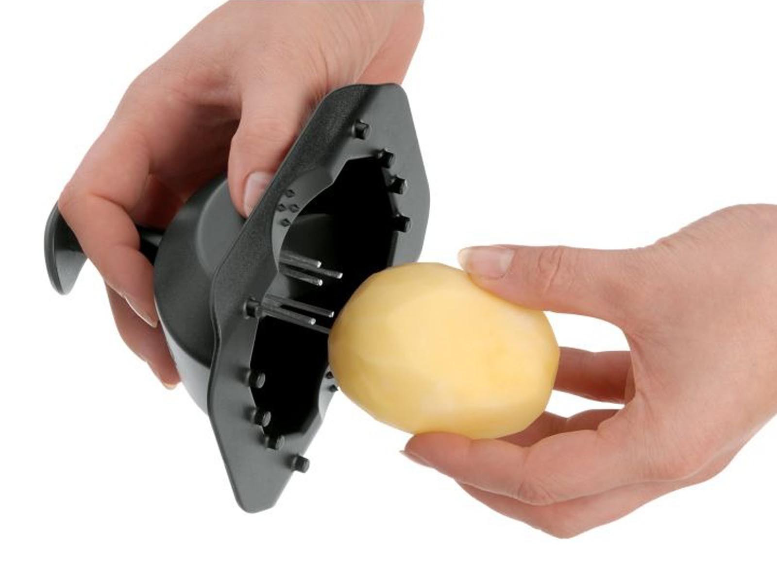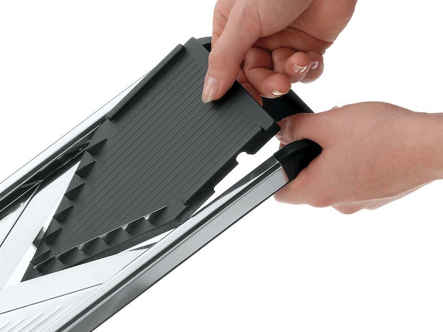 W zestawie z tarką znajduje się zabezpieczający palce uchwyt do przytrzymywania warzyw podczas ich rozdrabniania.
