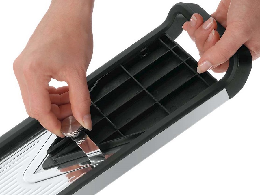 Elegancka i praktyczna kuchenna tarka z trzema wymiennymi ostrzami do szybkiego i prostego rozdrabniania warzywa do surówek, sałatek, zup i wielu innych dań.