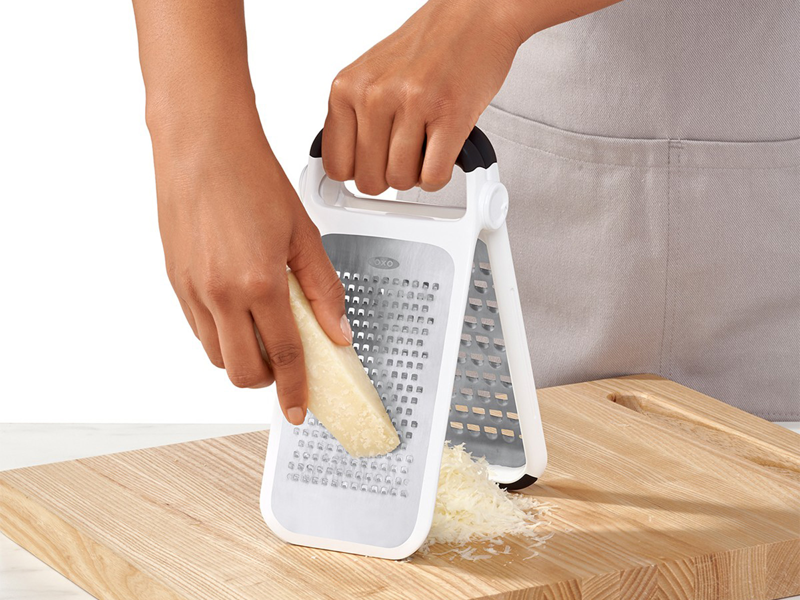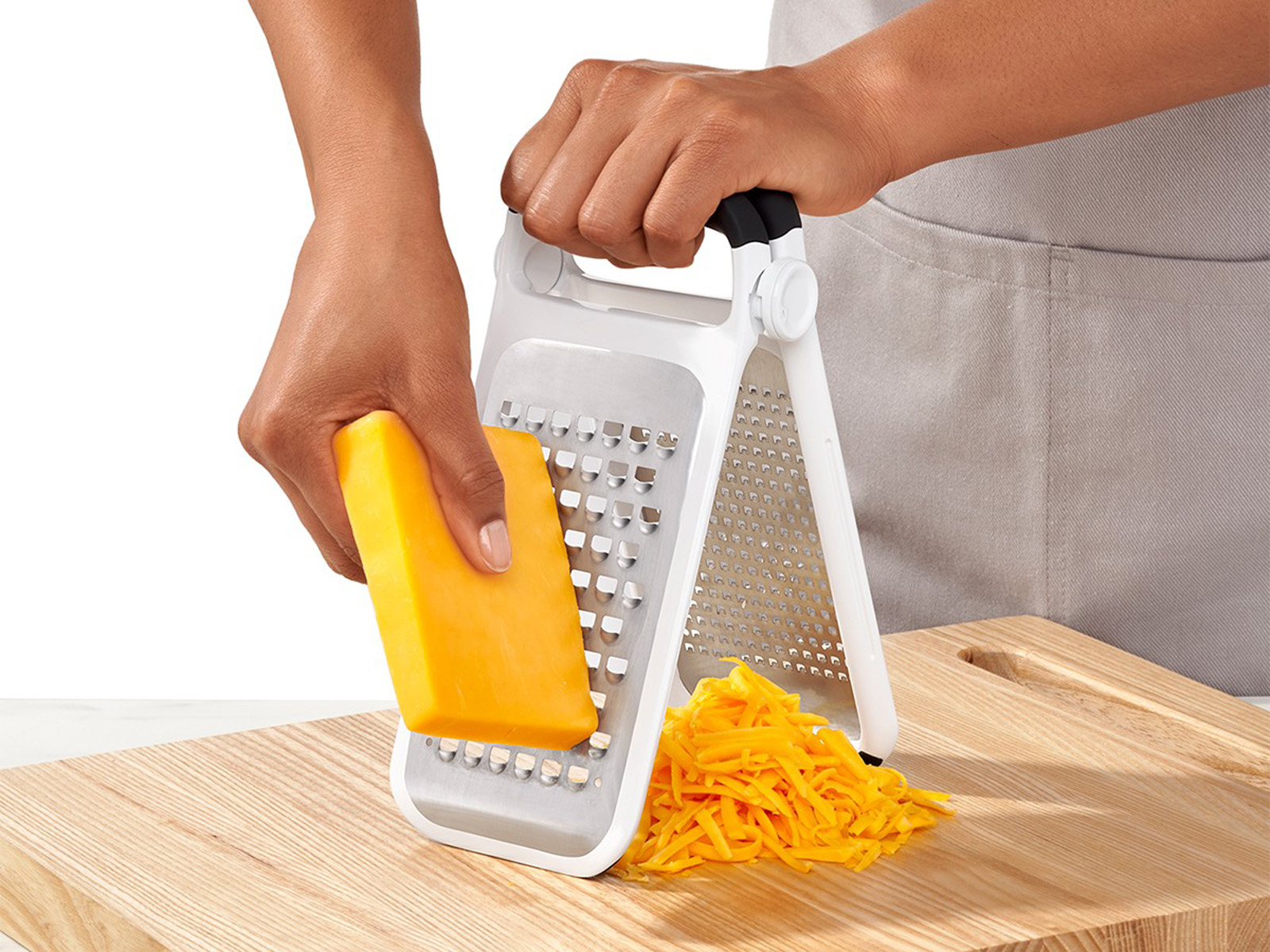 Zawiasy umożliwiają rozłożenie tarki w kształt litery "A" i jej swobodne postawienie na blacie lub złożenie na płasko.