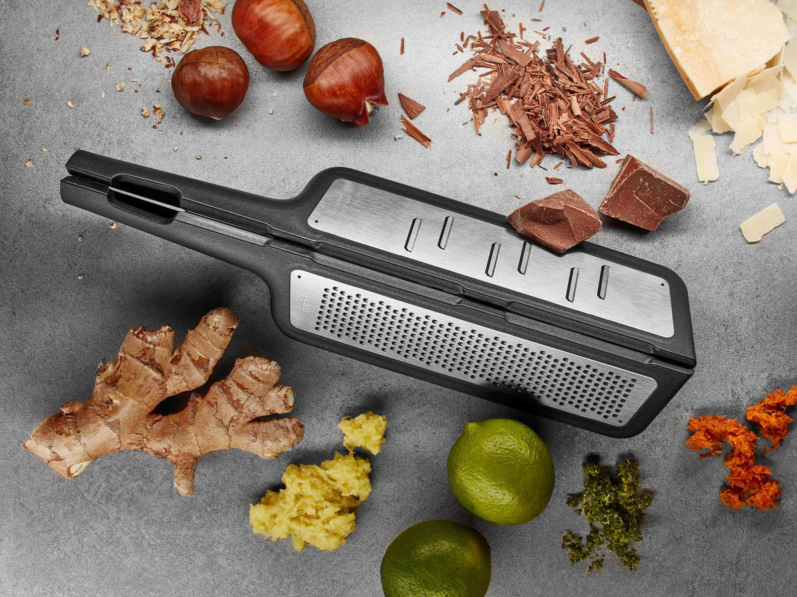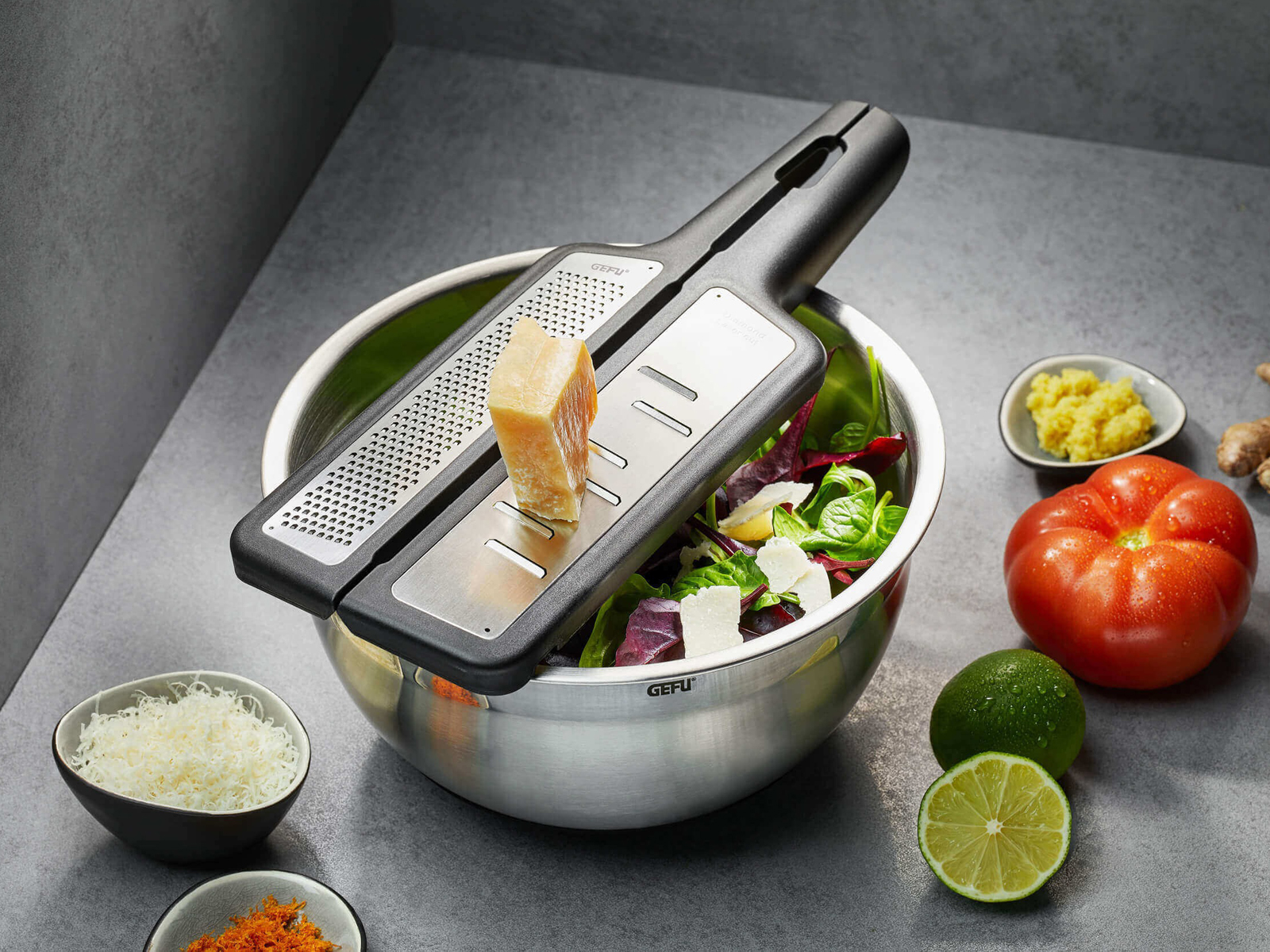 Tarka GEFU Rafino to wyjątkowe, składane narzędzie, które pozwala zaoszczędzić miejce w szafkach oraz połączyć funkcje krojenia i tarcia w jednej formie! Dwa stalowe ostrza, wykonane w technologii Diamond Laser Cut, zapewniają długotrwałą ostrość. Część z drobnymi oczkami świetnie sprawdza się przy ścieraniu parmezanu, czosnku czy skórki cytrusów, natomiast krajalnica ułatwia krojenie czekolady czy gałki muszkatołowej. Silikonowa stopka stabilizuje tarkę podczas pracy, a ergonomiczny uchwyt i pętla do zawieszania zwiększają wygodę użytkowania.