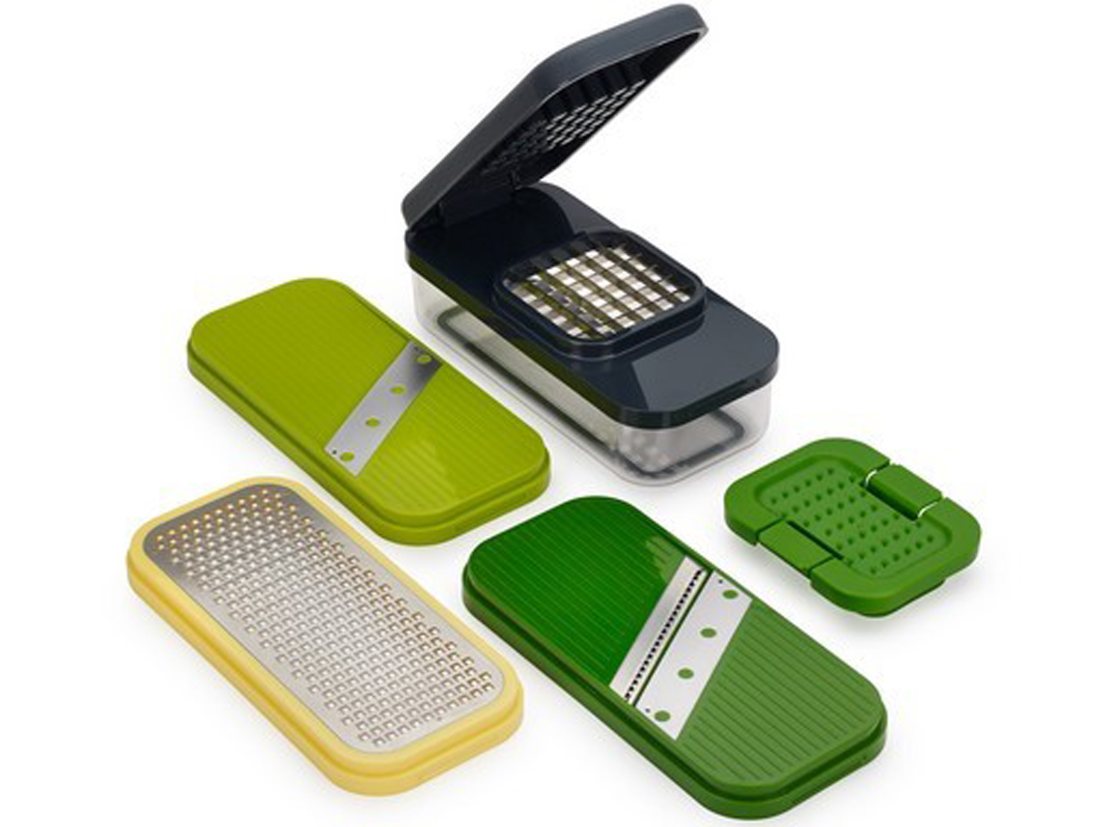 Tarka Joseph Joseph Multi-PrepComp łączy kilka różnych sposobów obrabiania składników z barwnym wykończeniem całości.