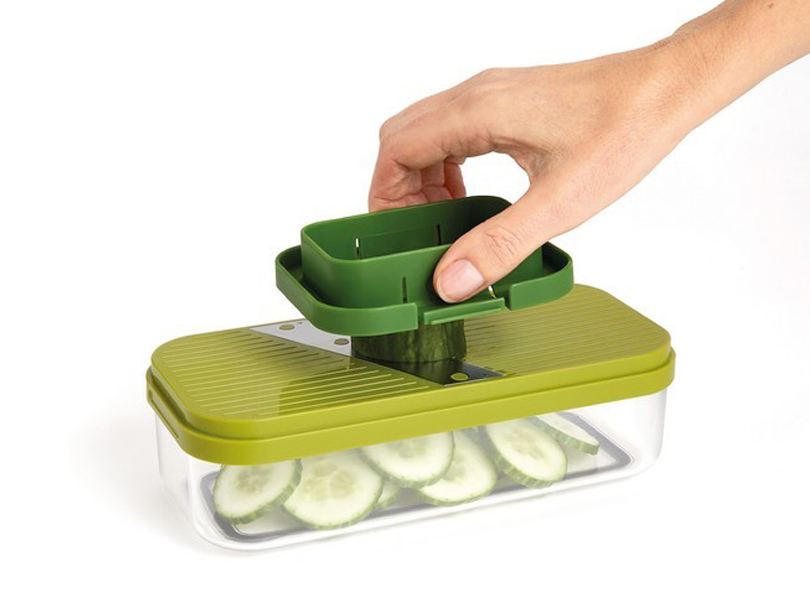 Ostrza wykonane są ze stali nierdzewnej, a obudowa z tworzywa sztucznego wolnego od BPA. Komfort użytkowania zwiększa antypoślizgowa podstawa oraz możliwość układania elementów jedno na drugim.