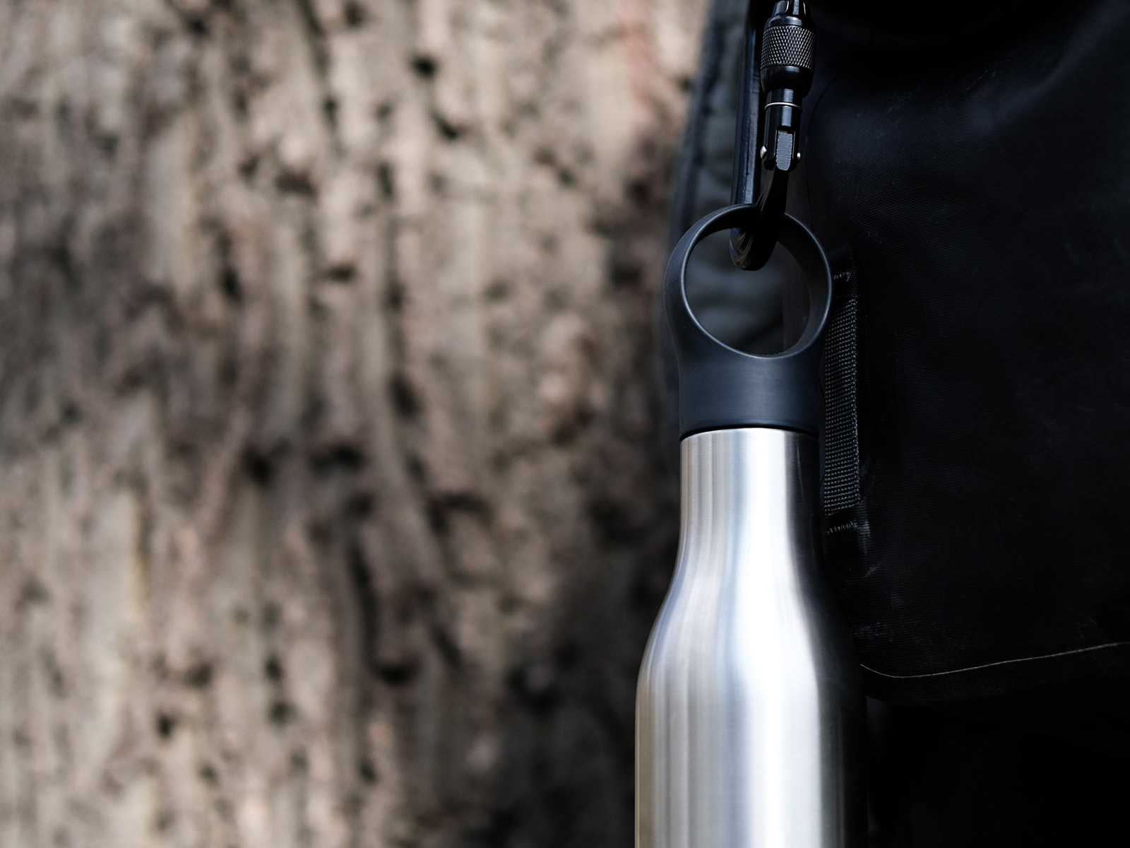 Butelka ze szczelną pokrywką z okrągłym wygodnym uchwytem, który umożliwia przechowywanie go na szyjce butelki oraz ułatwia przenoszenie termosu - dzięki uchwytowi można przypić butelkę np. do plecaka.