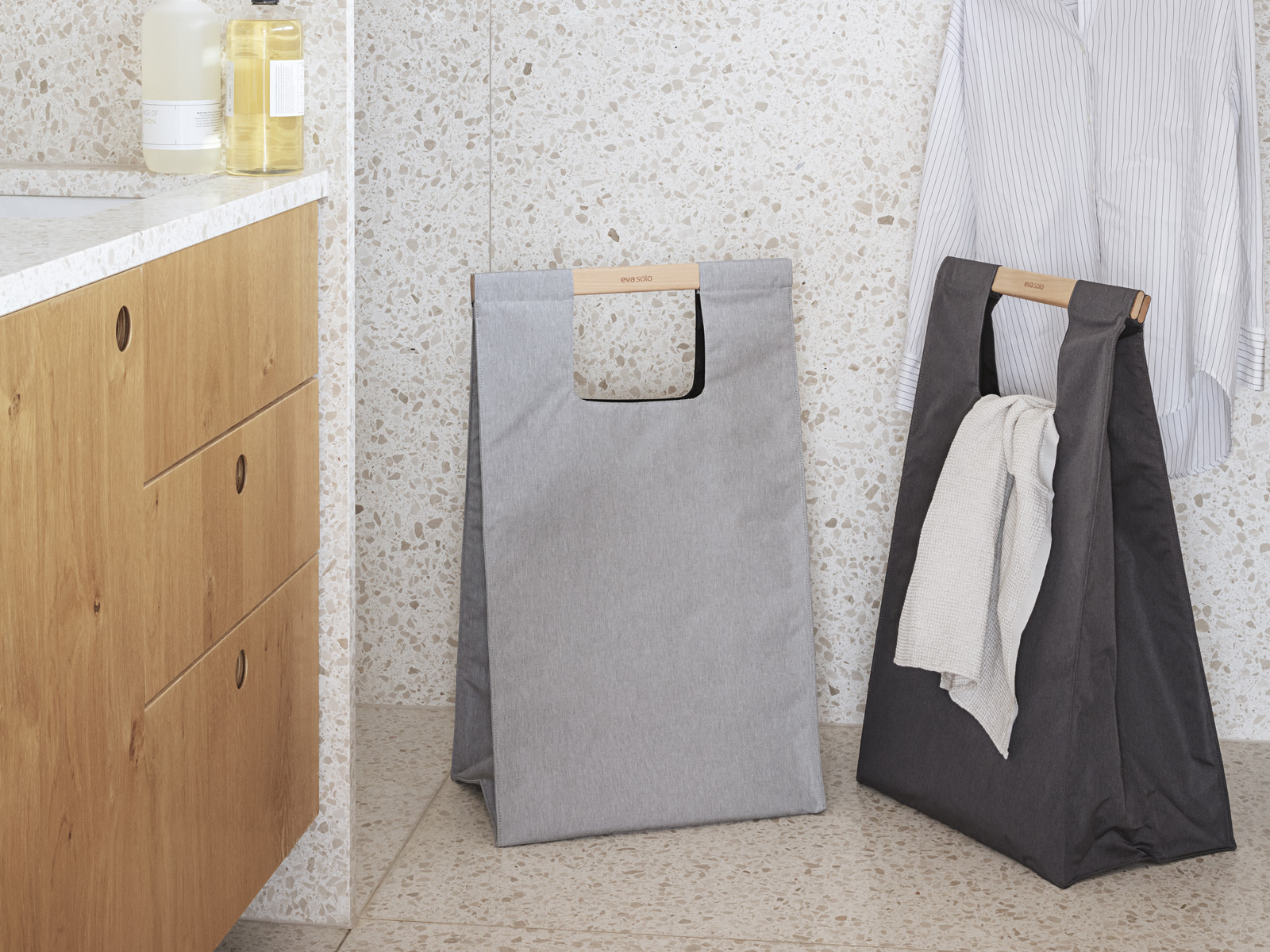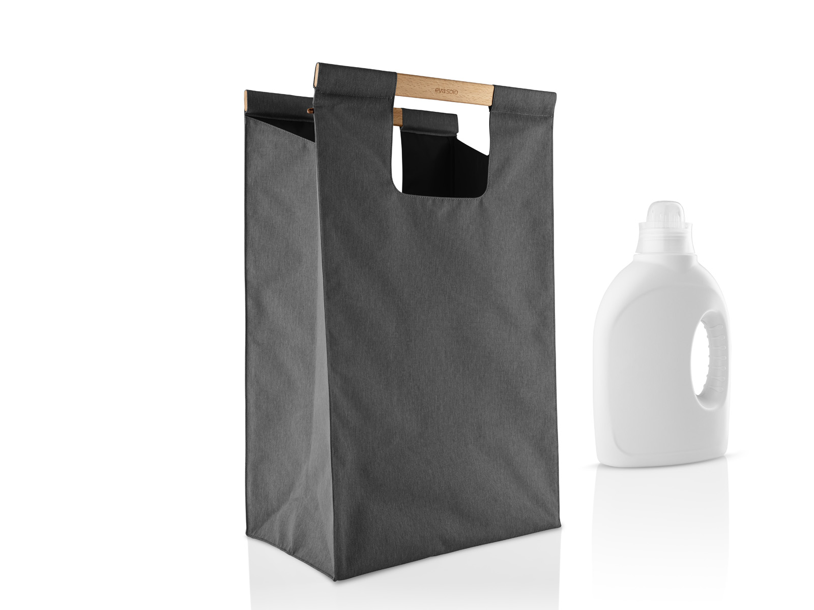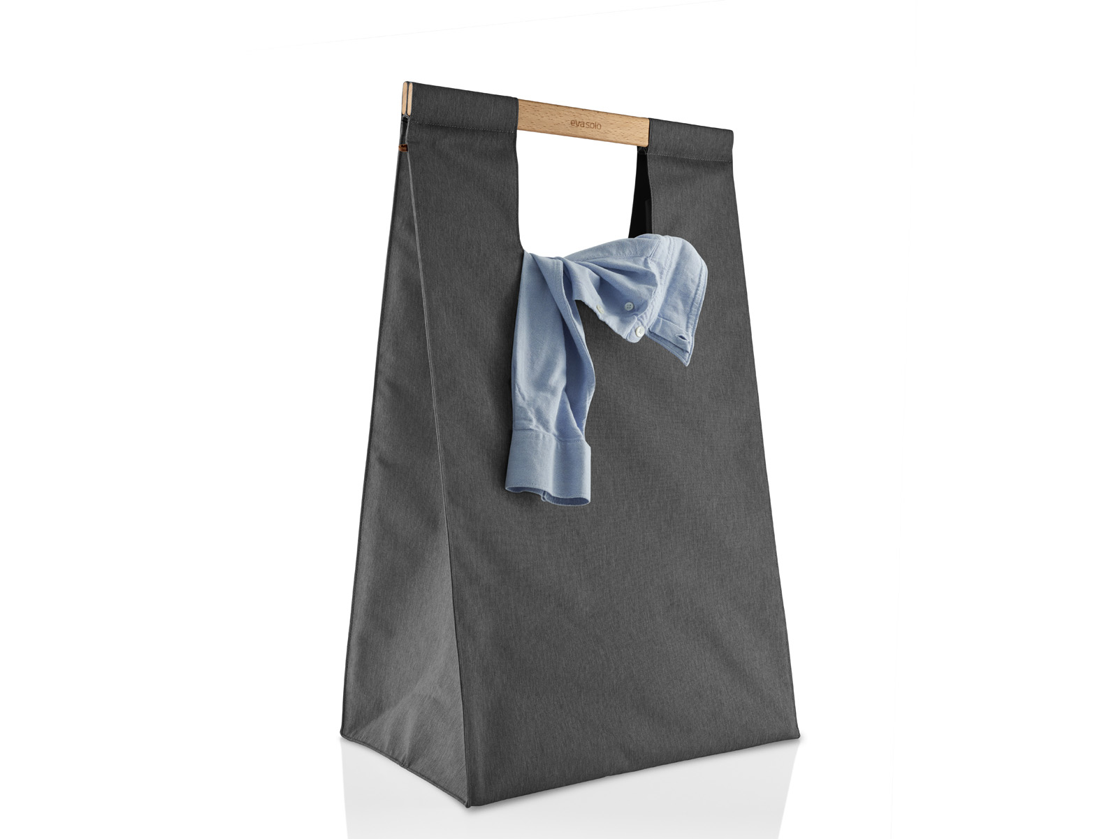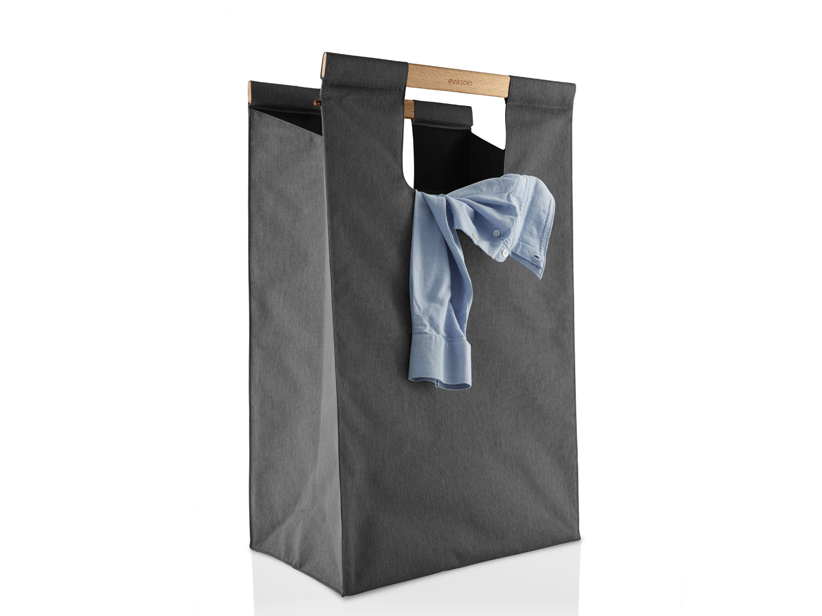 Kosz wykonany z materiału z wewnętrzną nylonową warstwą umożliwiającą łatwe utrzymanie go w czystości, posiada solidne wykonane z naturalnego drewna bukowego uchwyty z zamknięciem na magnes.