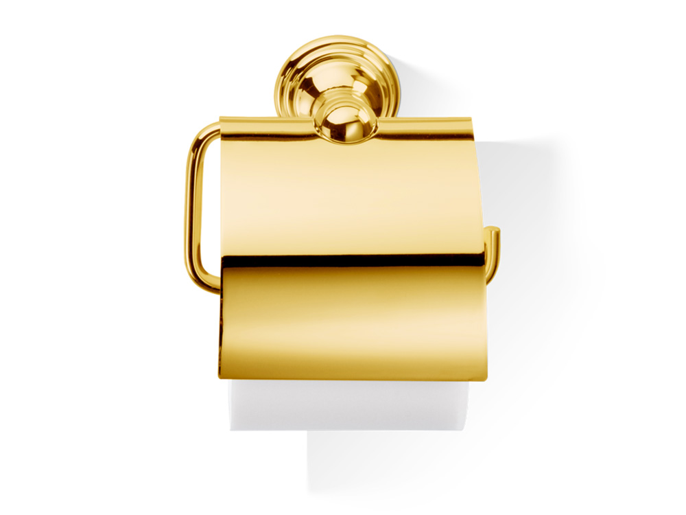 Elegancki ścienny uchwyt na papier toaletowy z ozdobnym mocowaniem wykonany z wysokiej jakości pozłacanego 24-karatowym złotem mosiądzu.
