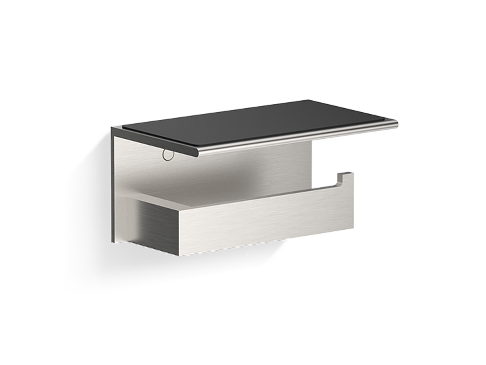 Elegancki ścienny uchwyt na papier toaletowy z półeczką o sylikonowej miękkiej powierzchni w czarnym kolorze.