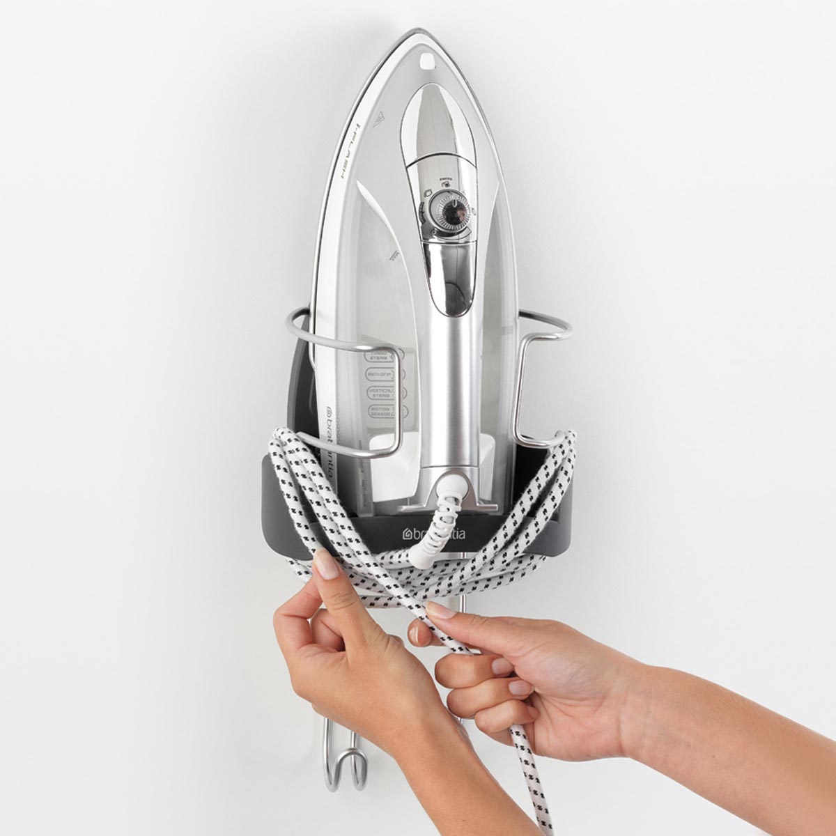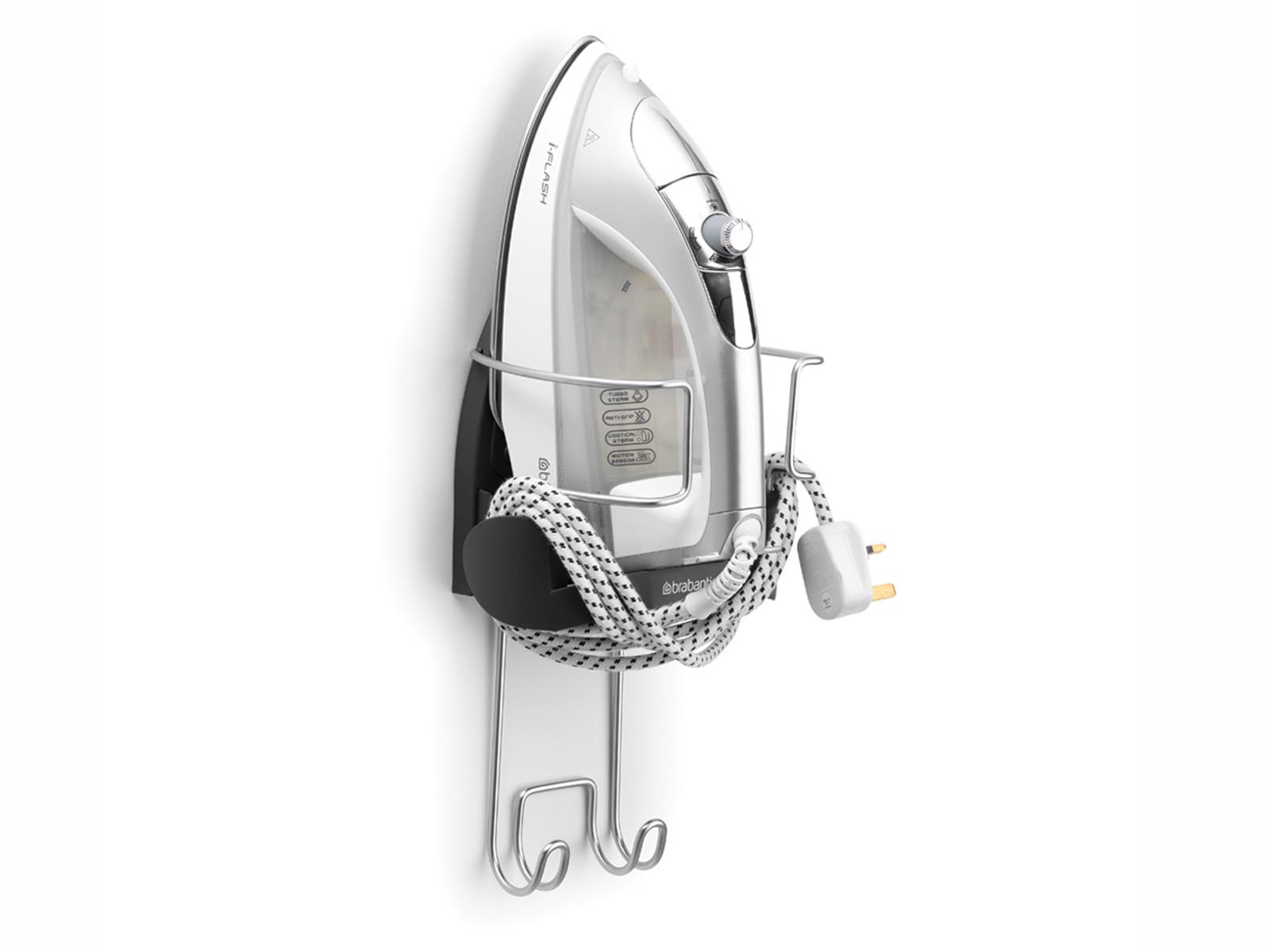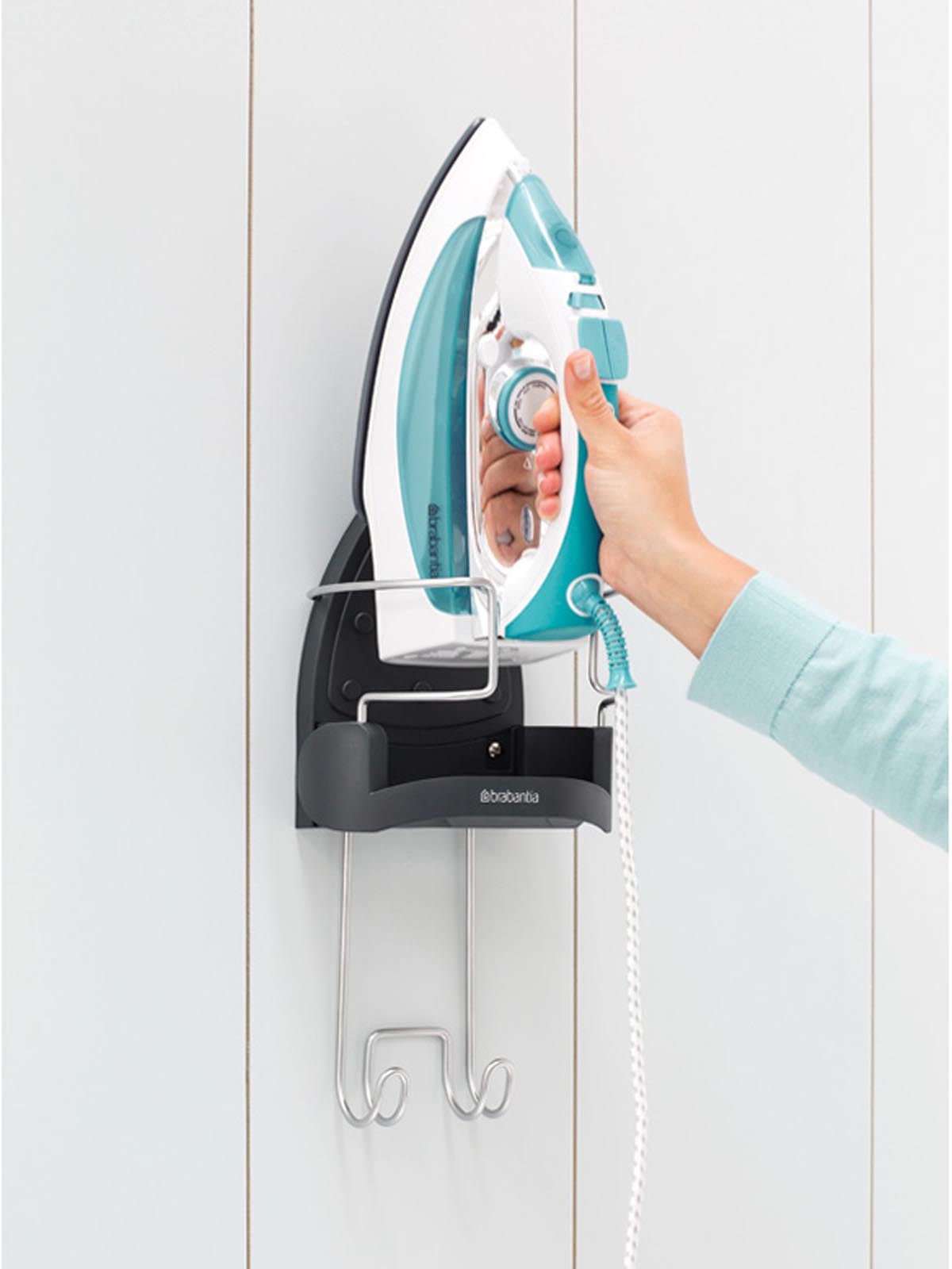 Uchwyt zabezpiecza gorącego żelazka przed dziećmi oraz uporządkowuje w mgnieniu oka akcesoria po prasowaniu.