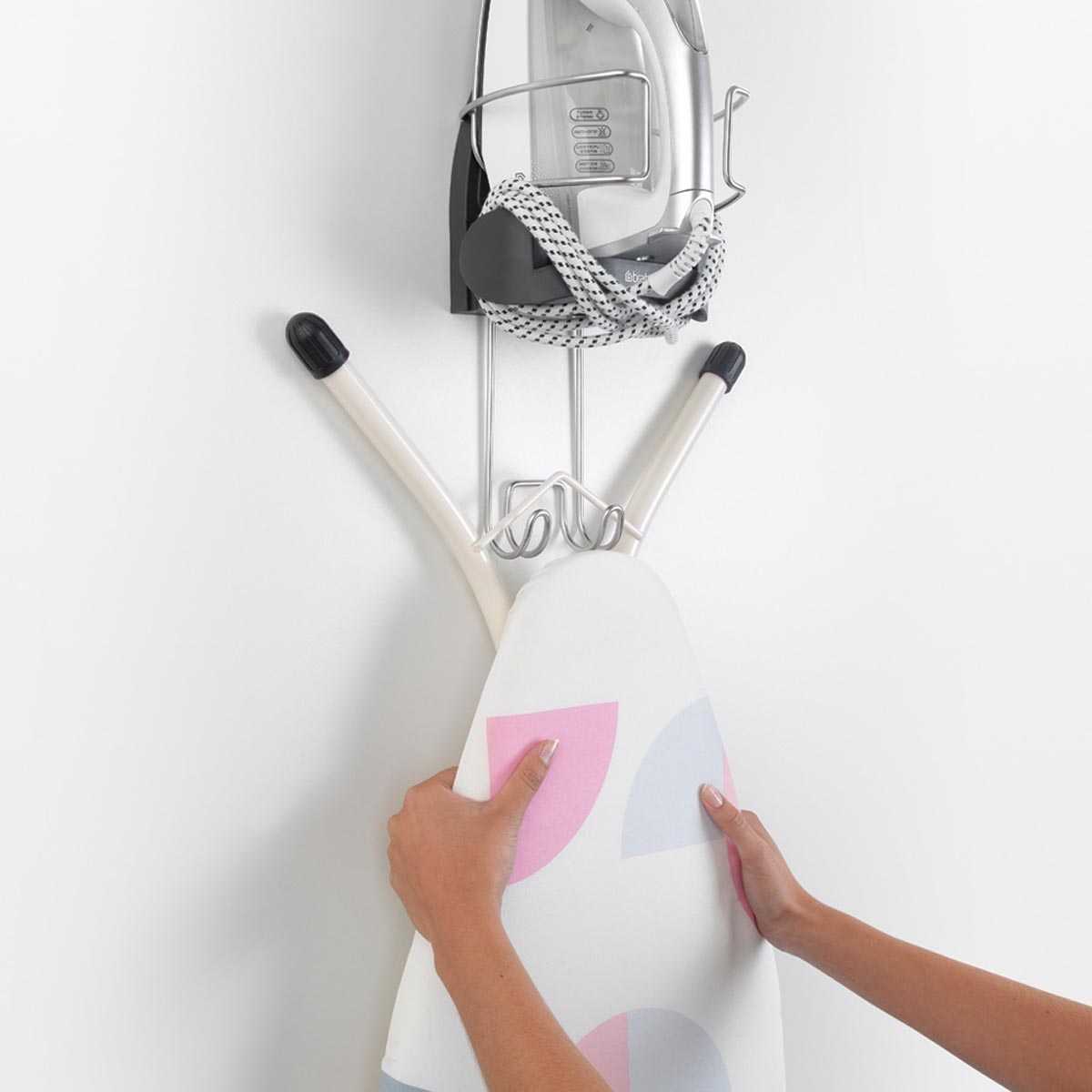Praktyczny ścienny uchwyt do przechowywania żelazka i deski do prasowania.