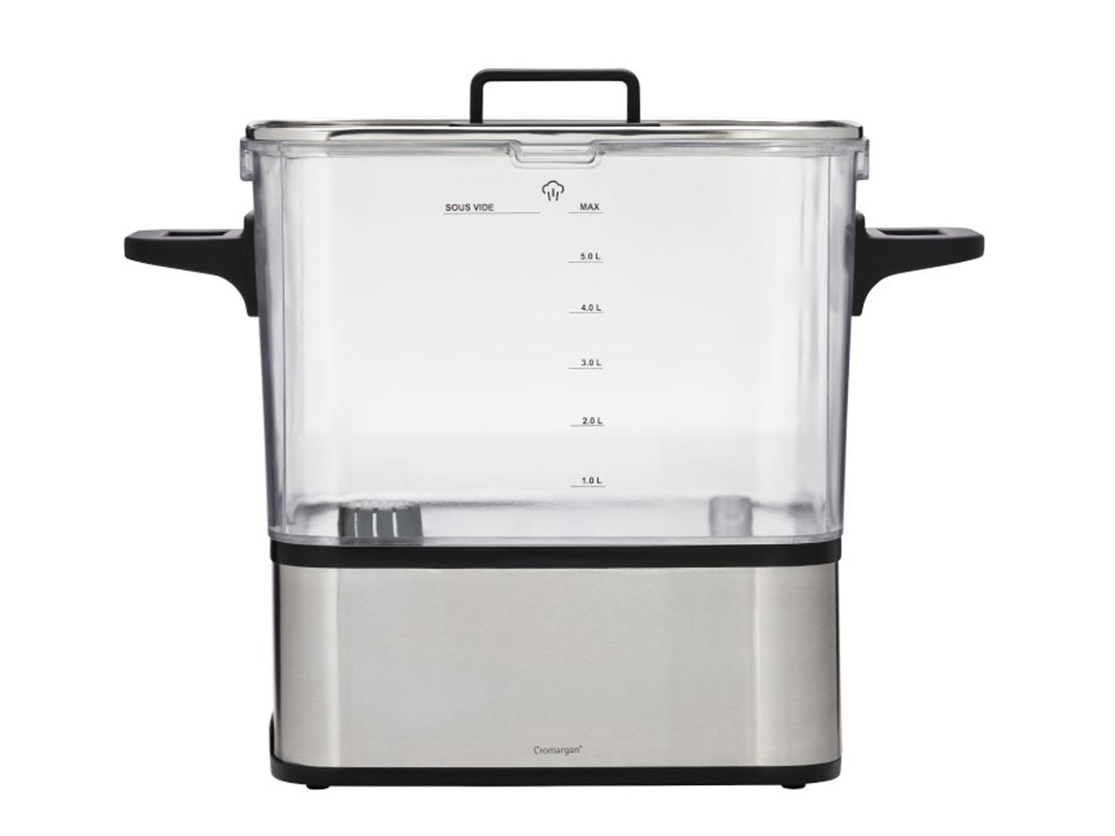 Eleganckie elektryczne namblatowe urządzenie kuchenne 2w1 umożliwiające delikatne gotowanie mięs, ryb i warzyw metodą sous vide (w próżniowej torebce) lub metodą slow food (gotowanie w wolnym tempie).