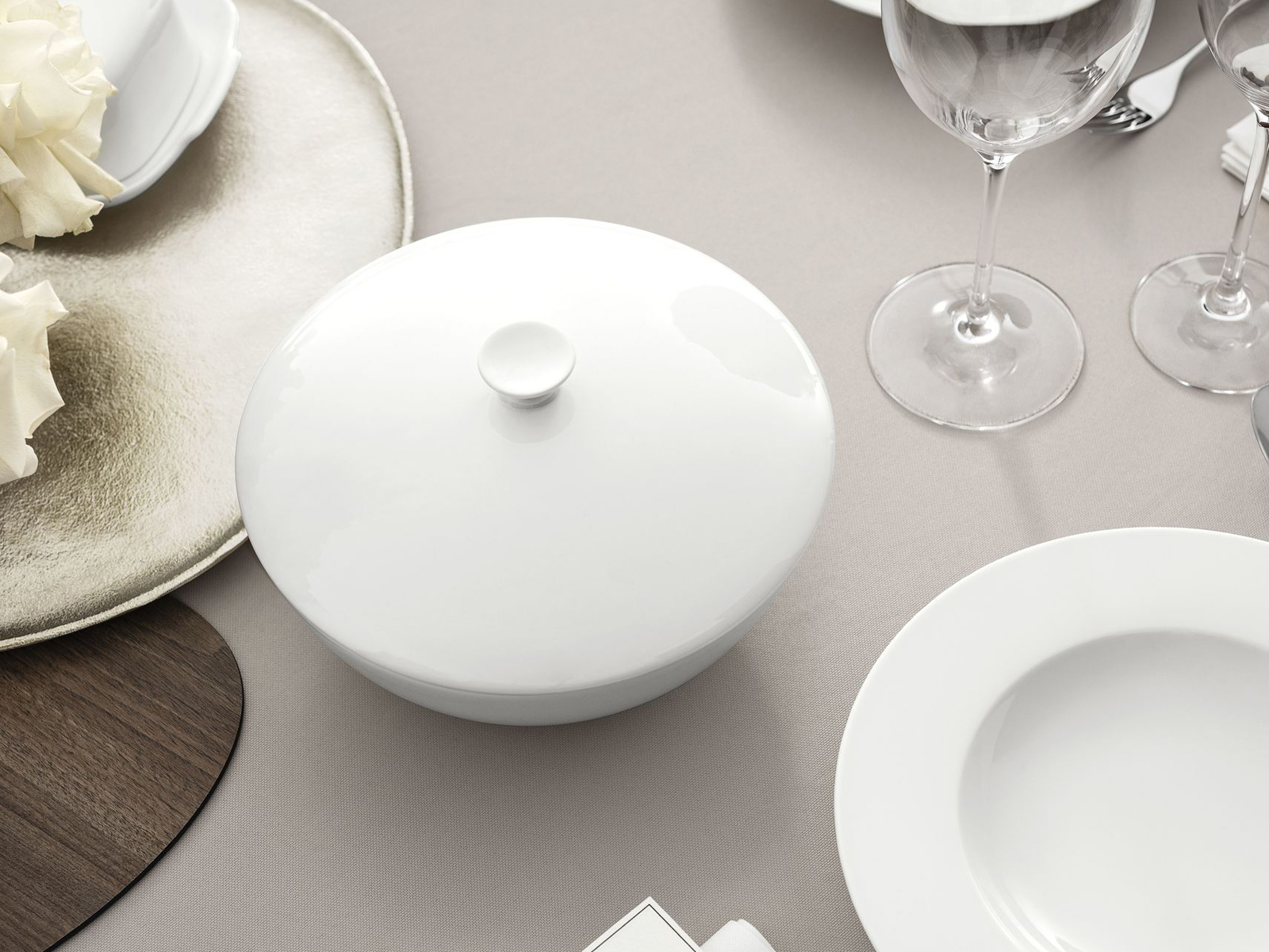 Piękna klasyczna forma, miękkie linie i najwyższej jakości błyszcząca porcelana Bone Porcelain dają razem niesamowity efekt w postaci ponadczasowej zastawy stołowej, która zawsze budzi żywe emocje i nie traci swojego blasku.