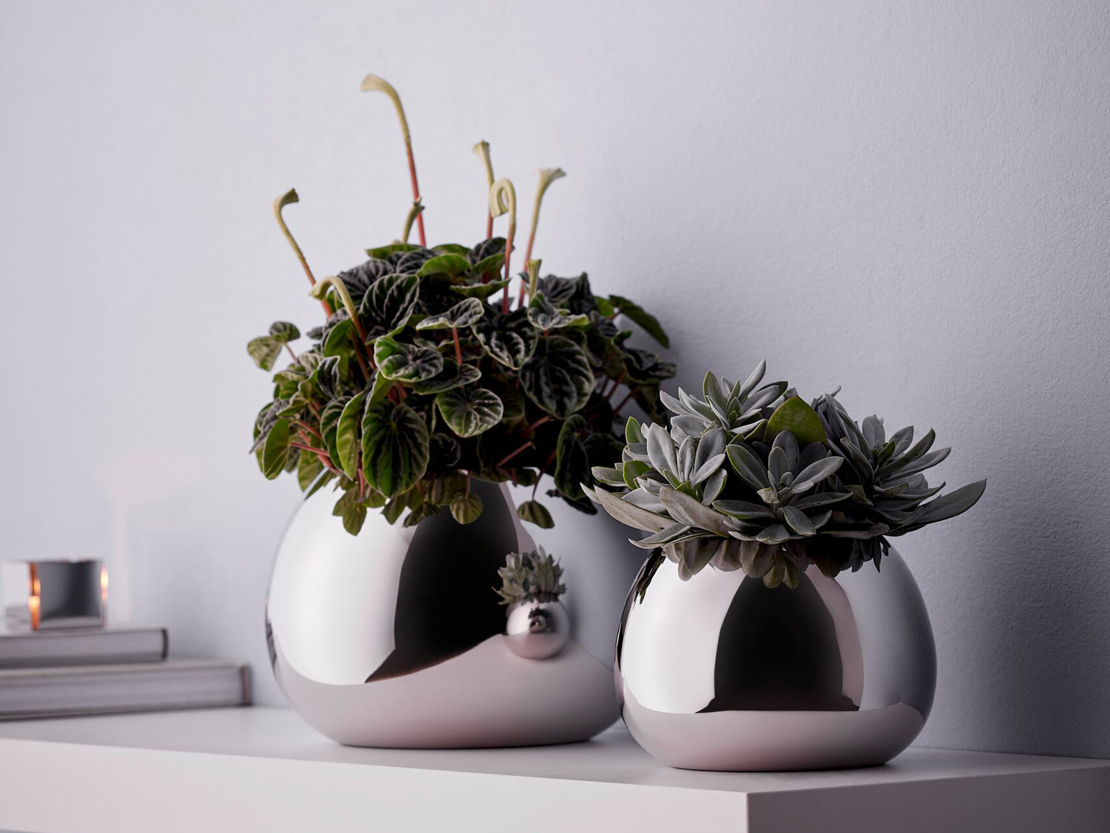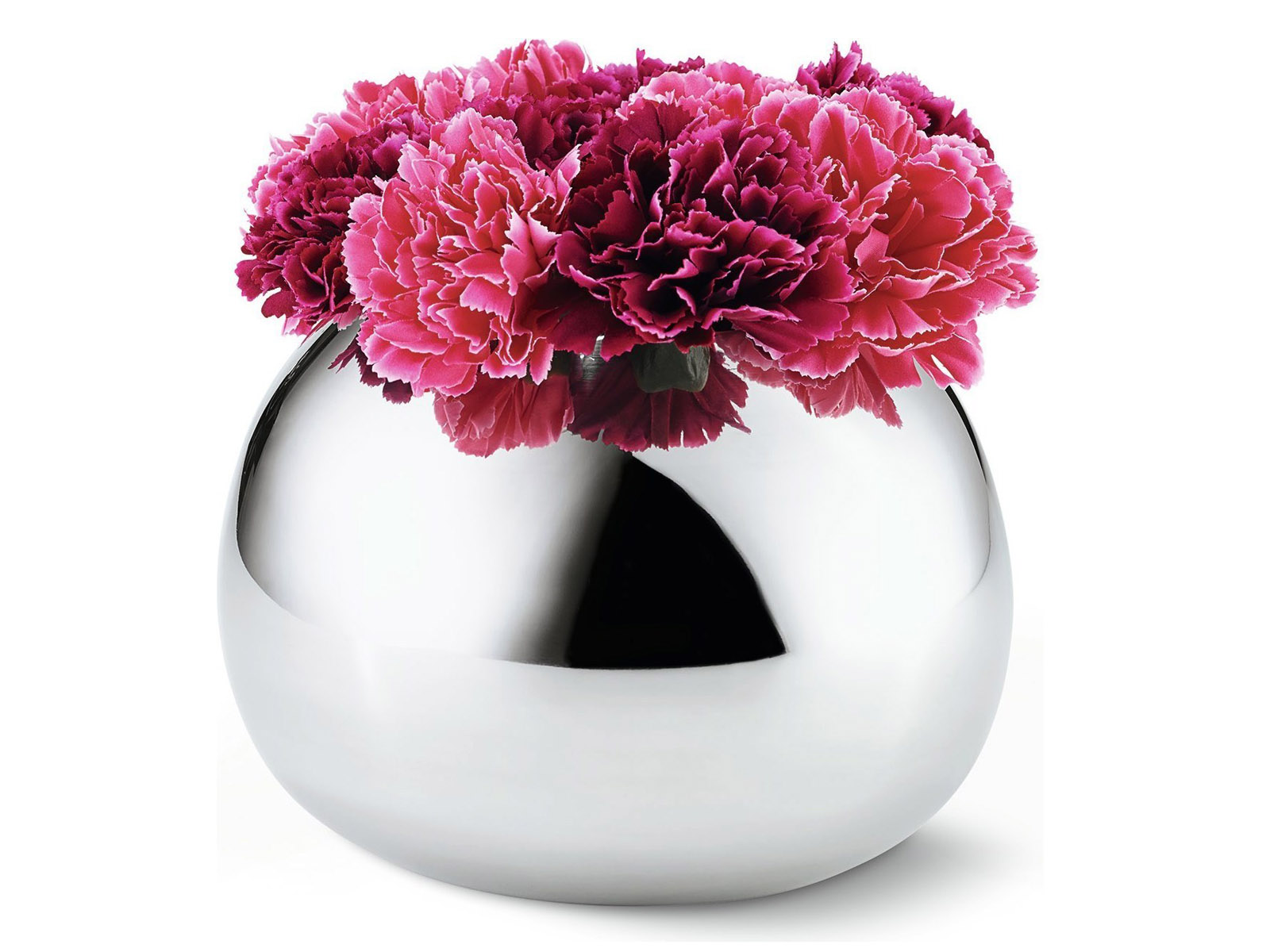 Wazon wykonany z polerowanej na wysoki połysku stali nierdzewnej.