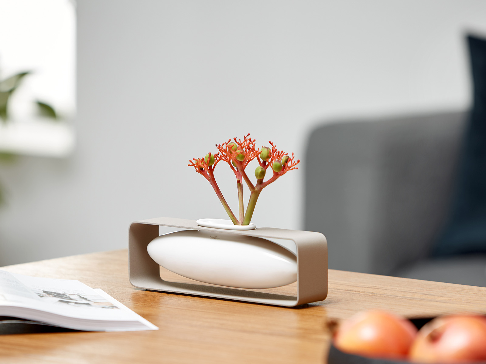 Oryginalny dekoracyjny porcelanowy wazon na kwiaty zawieszony swobodnie na metalowej prostokątnej ramie.