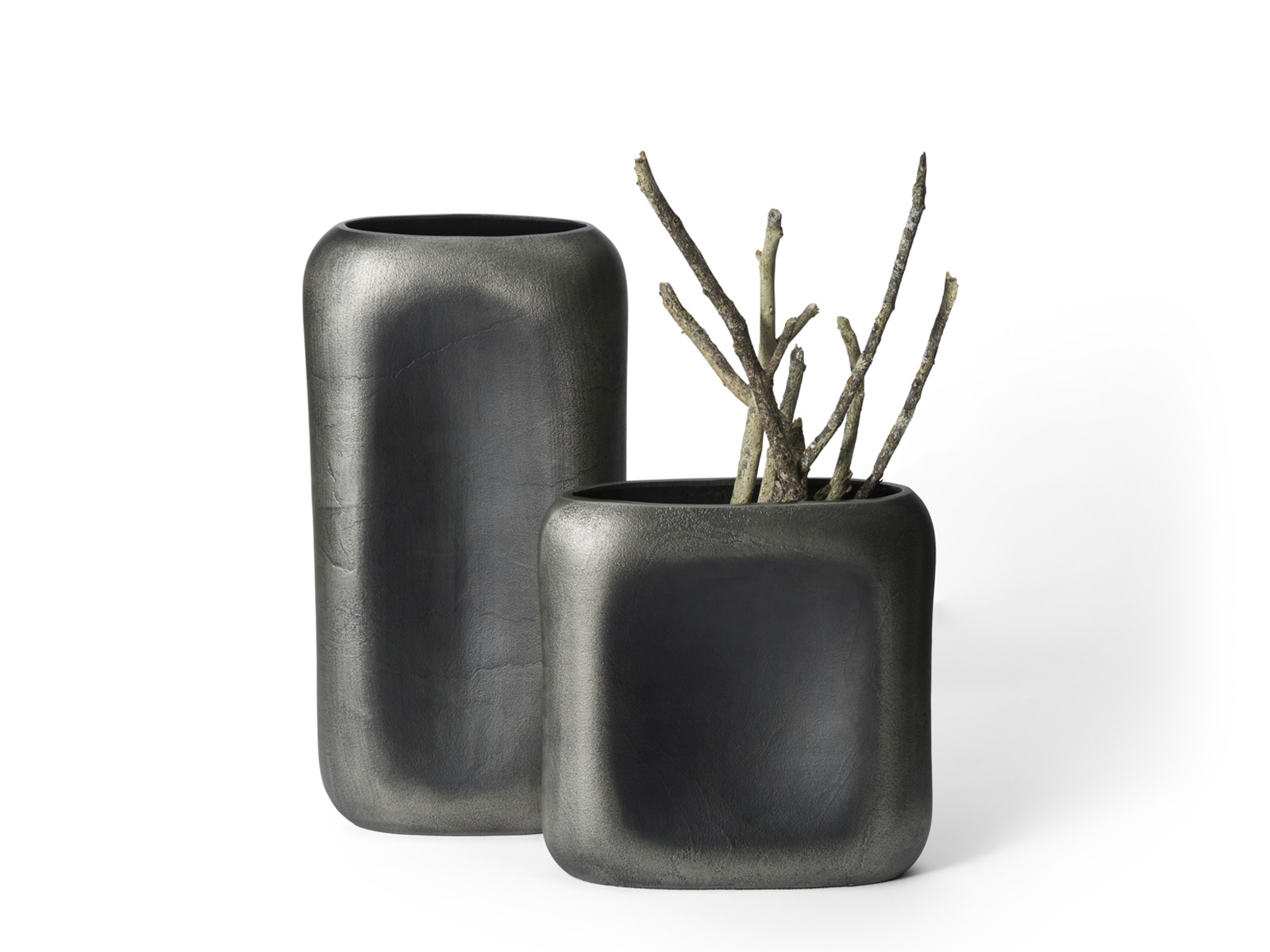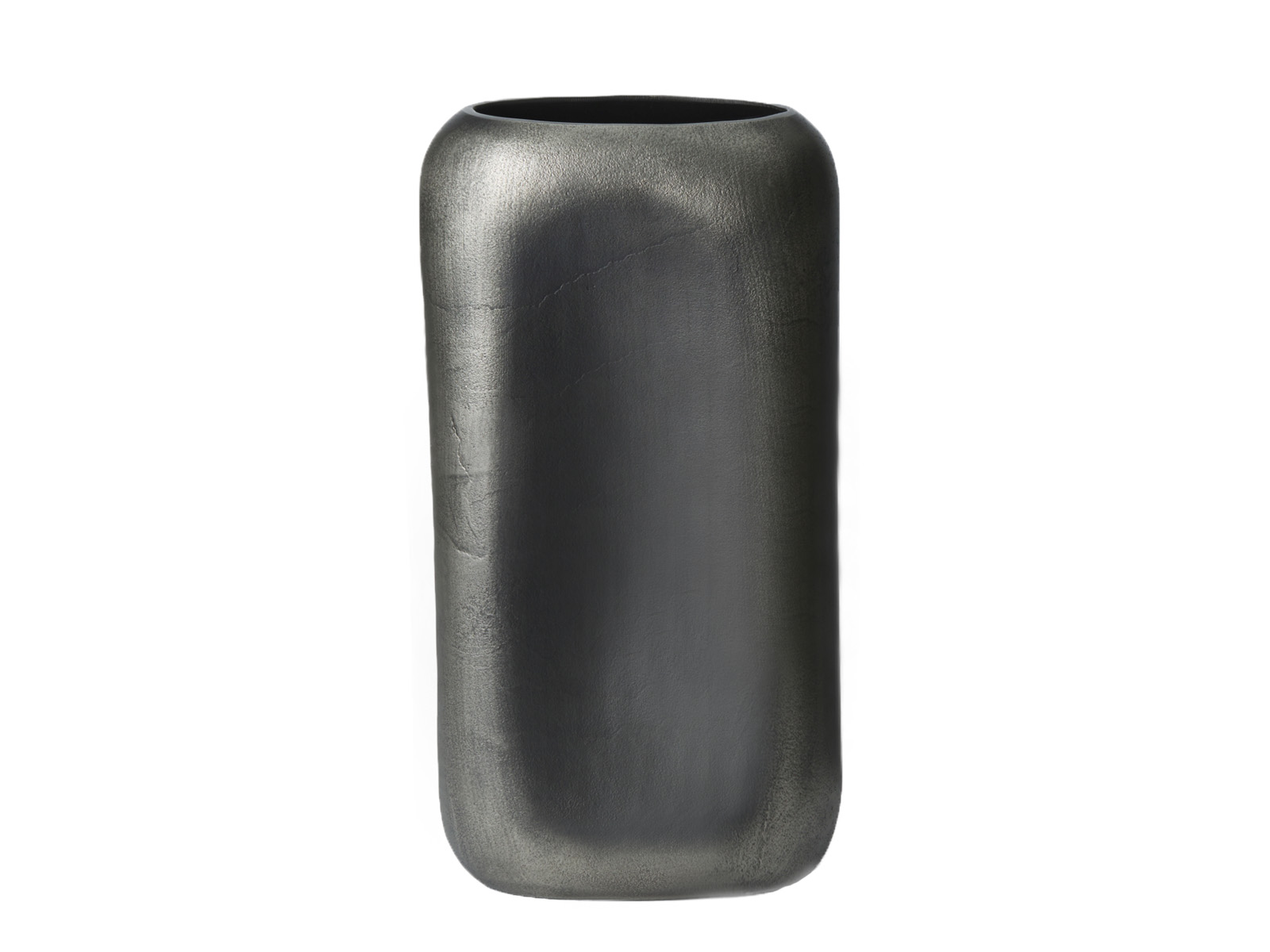 Wazon wykonany z malowanego aluminium ze stylizowaną powierzchnią o surowym wyglądzie przypominającym naturalny polerowany kamień.