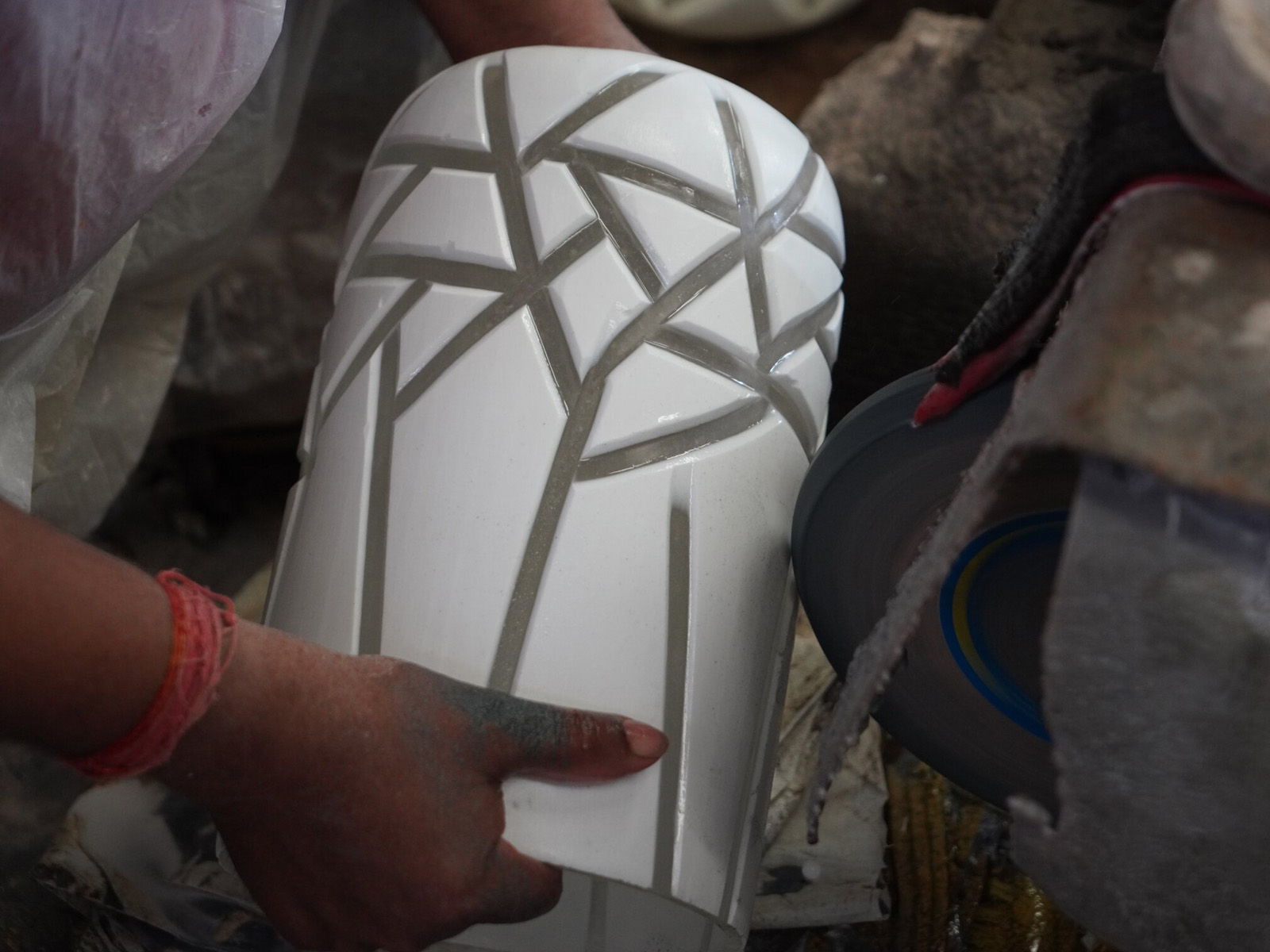 Wazon wykonany z ręcznie dmuchanego szkła i ręcznie frezowaną wierzchnią warstwą - cięty w błyszczącym szkle wzór daje efekt witrażu, światło przedostaje się tylko przez frezowane miejsca.