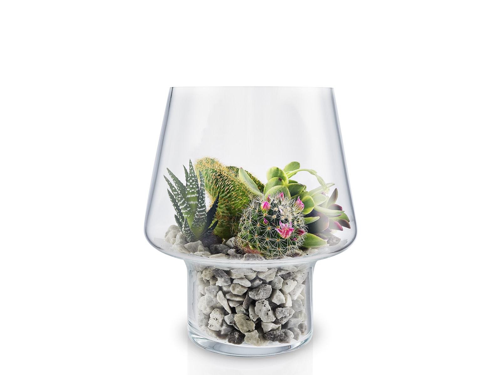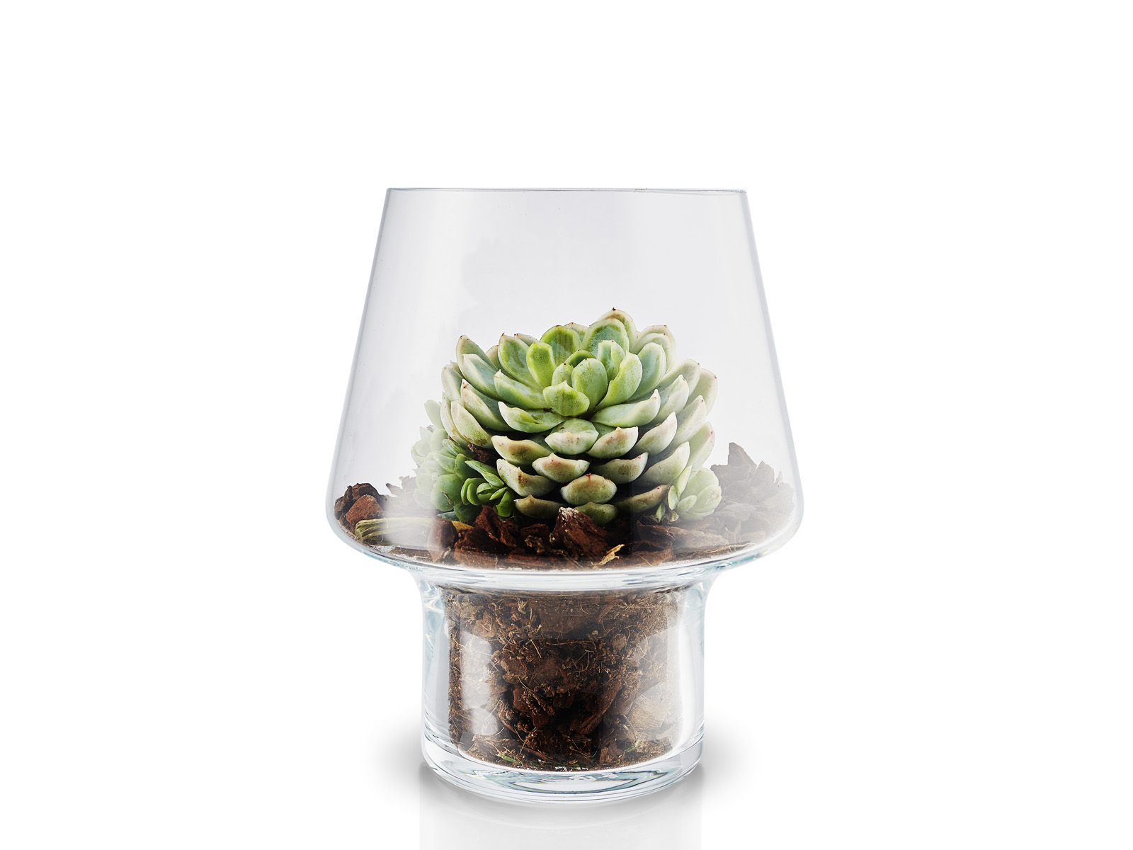 Wazon wykonany z przezroczystego bezbarwnego szkła dmuchanego zapewniającego optymalne warunki wzrostu dla sukulentów - sukulenty są bardzo dekoracyjne i łatwe w pielęgnacji o ile mają dużo światła i wody.