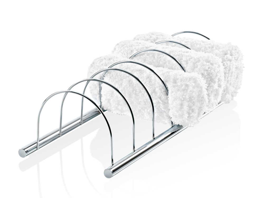 Elegancki uchwyt na ręczniki o ażurowej konstrukcji z profilowanymi w łuk poprzeczkami do przechowywania 6-ciu sztuk ręczników gościnnych.